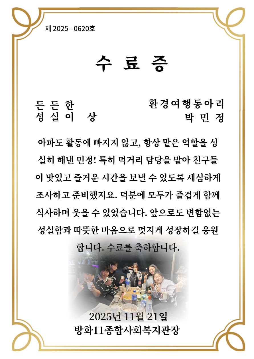 마지막으로 1년 동안 열심히 활동한 아이들을 격려하고 칭찬하기 위해 수료증을 수여했습니다.