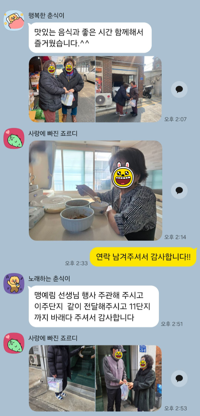 잔치가 끝난 뒤, 팀을 나누어 설날 꾸러미를 들고 직접 찾아가는 잔치도 진행했습니다. 공항동 곳곳을 방문하며 설 인사를 전하고, 잔치에 함께하지 못한 주민들에게도 마음을 나누고자 했습니다.