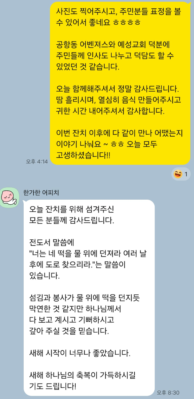 마지막으로, 공항동 예성교회 사모님께서 설날 잔치 과정이 담긴 영상을 제작해주셨습니다. 영상을 통해 그날의 분위기를 다시 보니, 그날의 따뜻함을 다시 느낄 수 있었습니다. 저 역시 실천기록으로 잔치의 과정들을 잘 녹여 공항동의 이야기들을 생동감 있게 전달하고자 합니다.