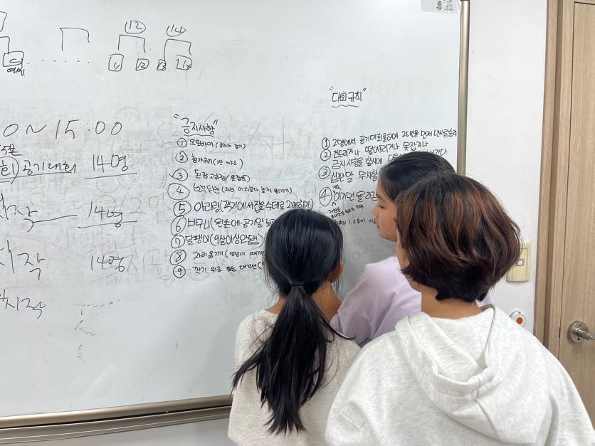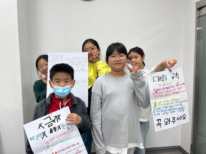 그렇게 6명의 공기대회 기획단 친구들은 함께 금지사항과 대회 규칙을 의논하며 꼼꼼하게 정리했습니다.