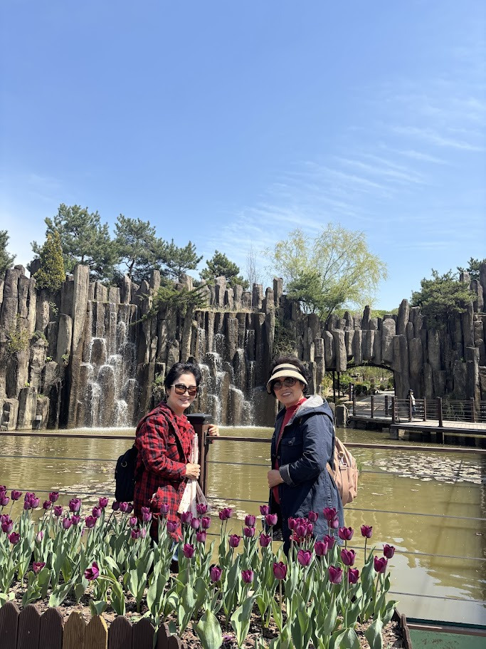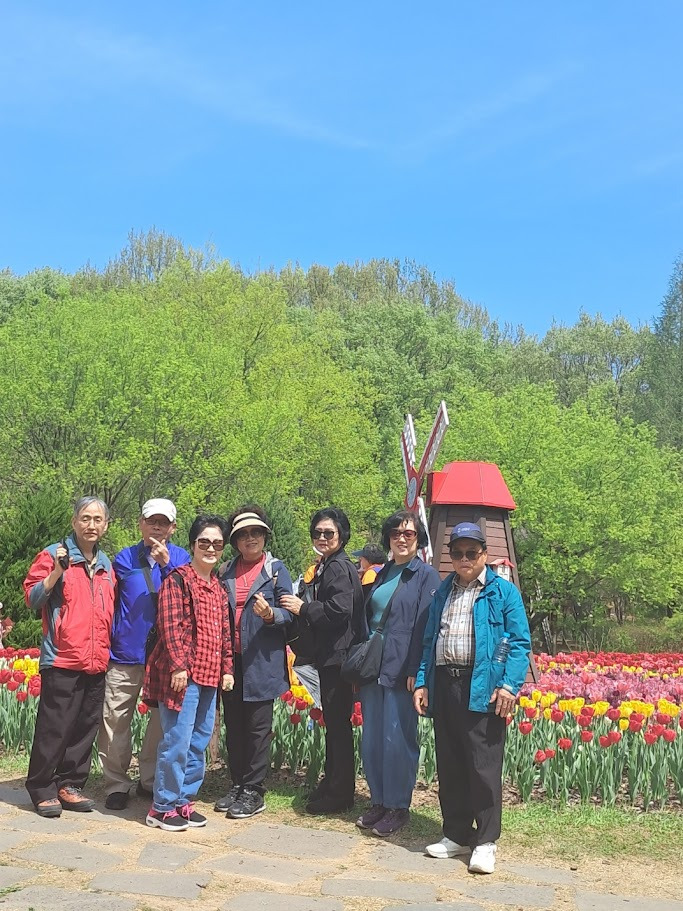 점심식사를 마친 다음에 삼삼오오 짝을 지어 곳곳에 핀 튤립을 구경했습니다. 회원님들께서 서로에게 봄 맞이 인생사진을 찍어주겠다며 포즈를 취하셨습니다. 꽃 구경을 마친 뒤에는 잠시 앉아서 숨 고르며 오늘 모임은 어땠는지 소감을 나눴습니다.