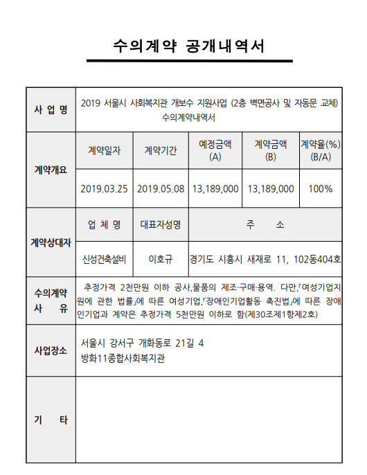 2019 서울시 사회복지관 개보수 지원사업 (2층 벽면공사 및 자동문 교체) 수의계약 공지(수정)