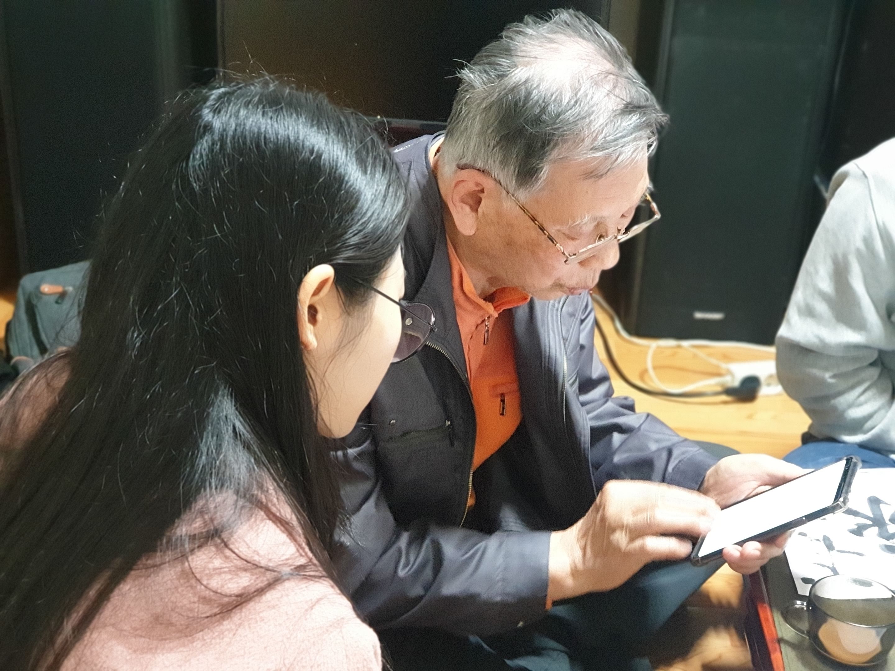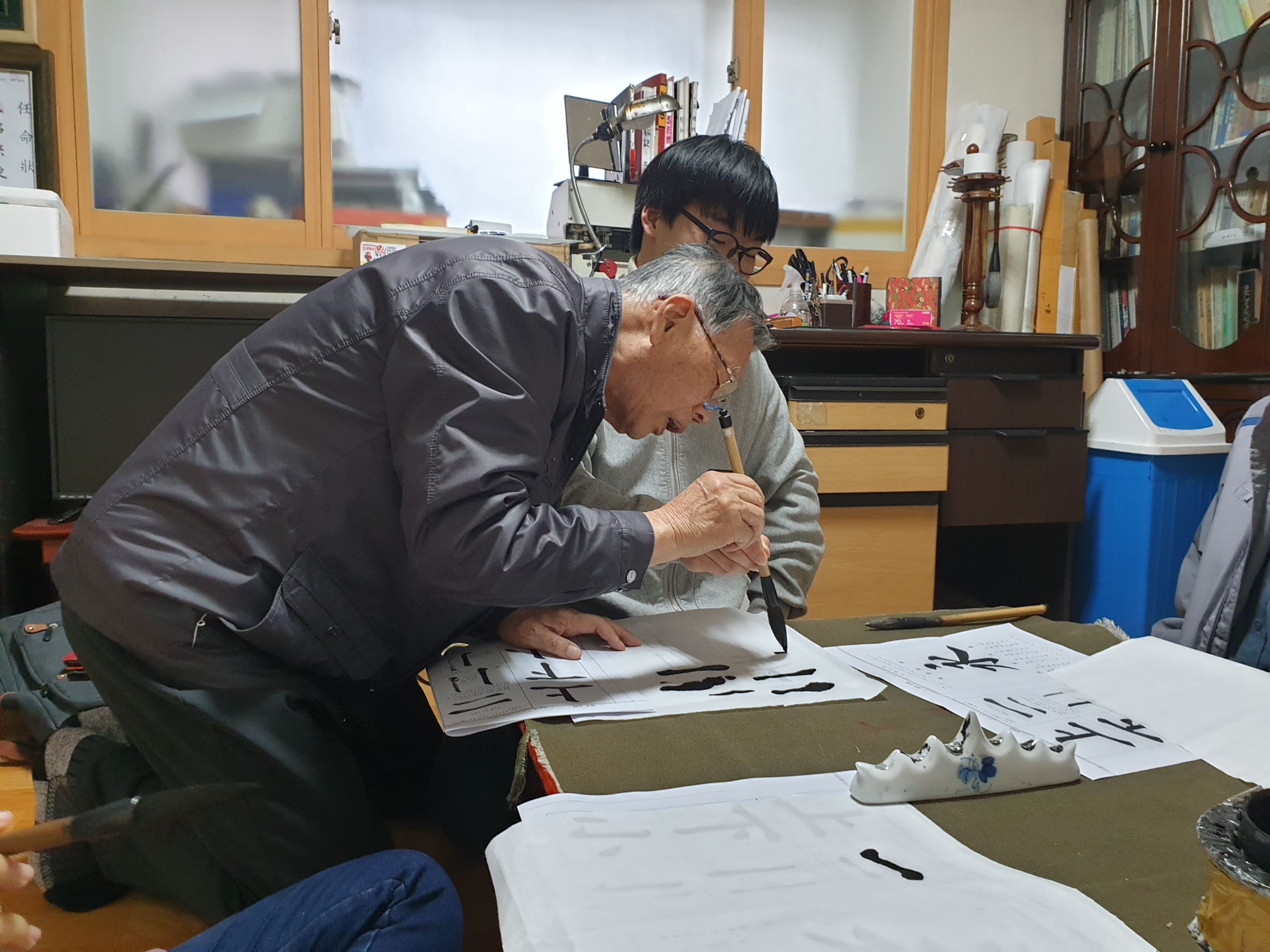 어르신이 서예 쓰는 방법 소개, 시범보이기,