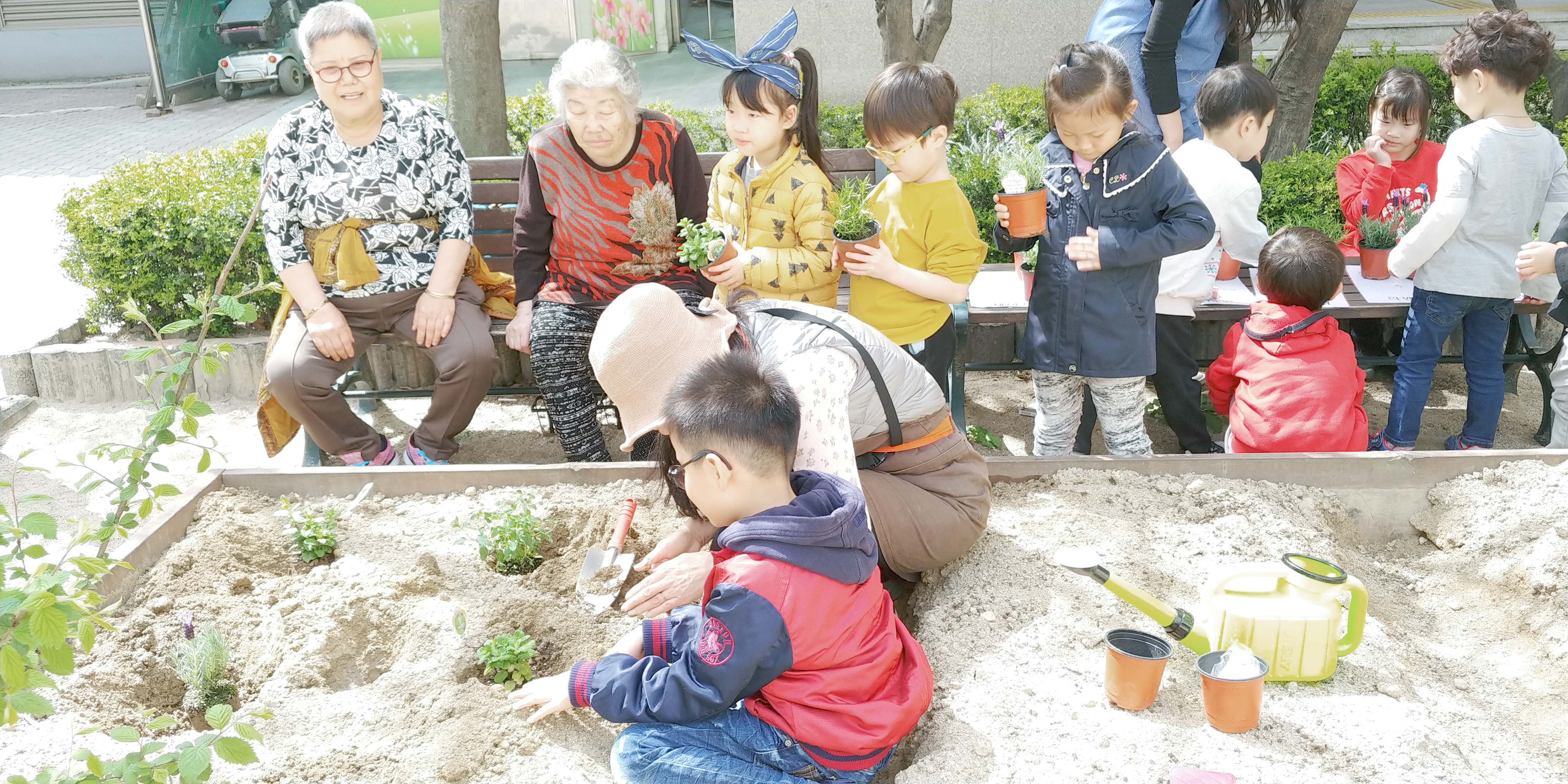 아이들과 함께 텃밭에서 허브식물을 심으며