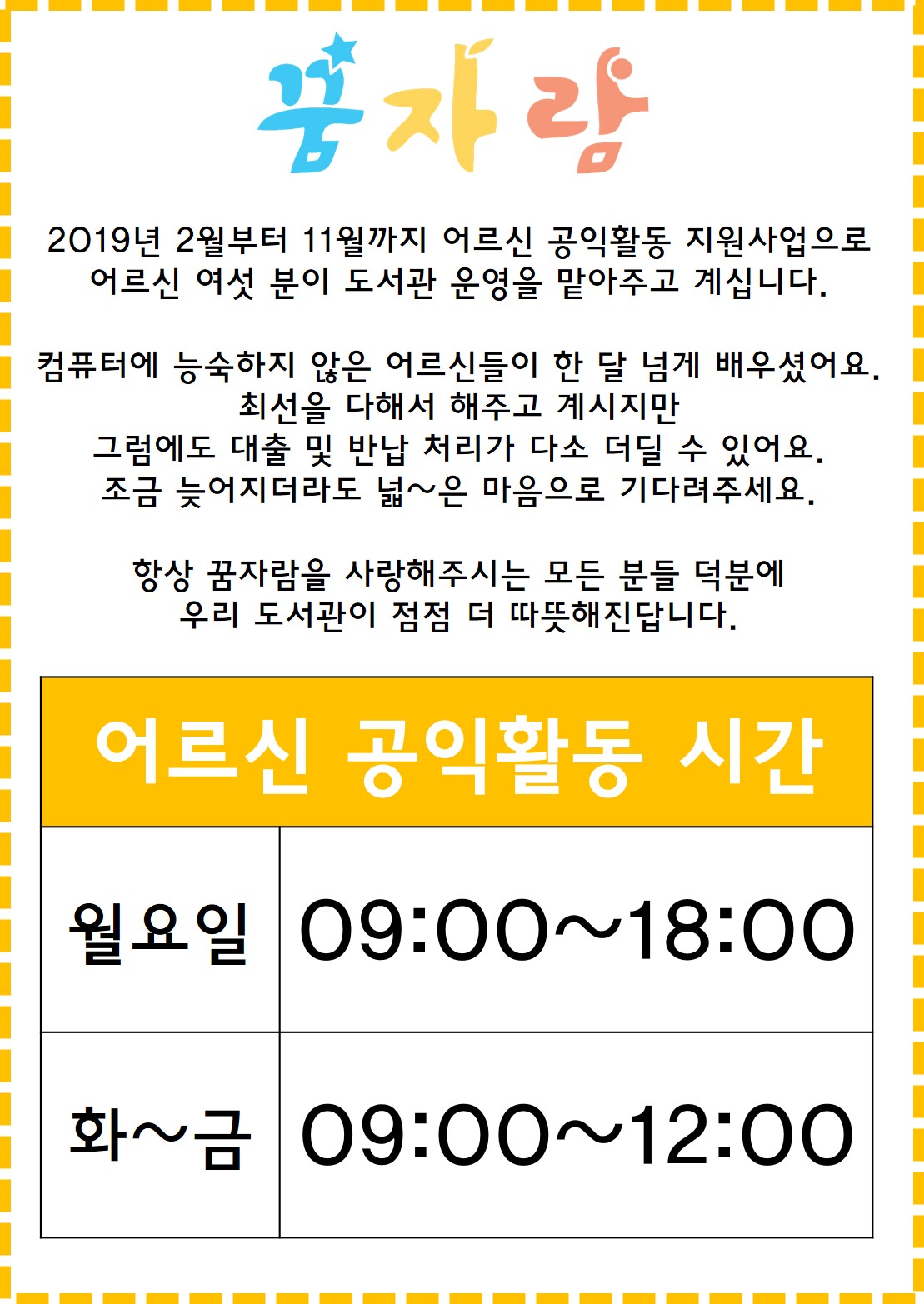 꿈자람 책 놀이터에 여섯 분이 어르신 일자리 사업으로 근무하고 계십니다.