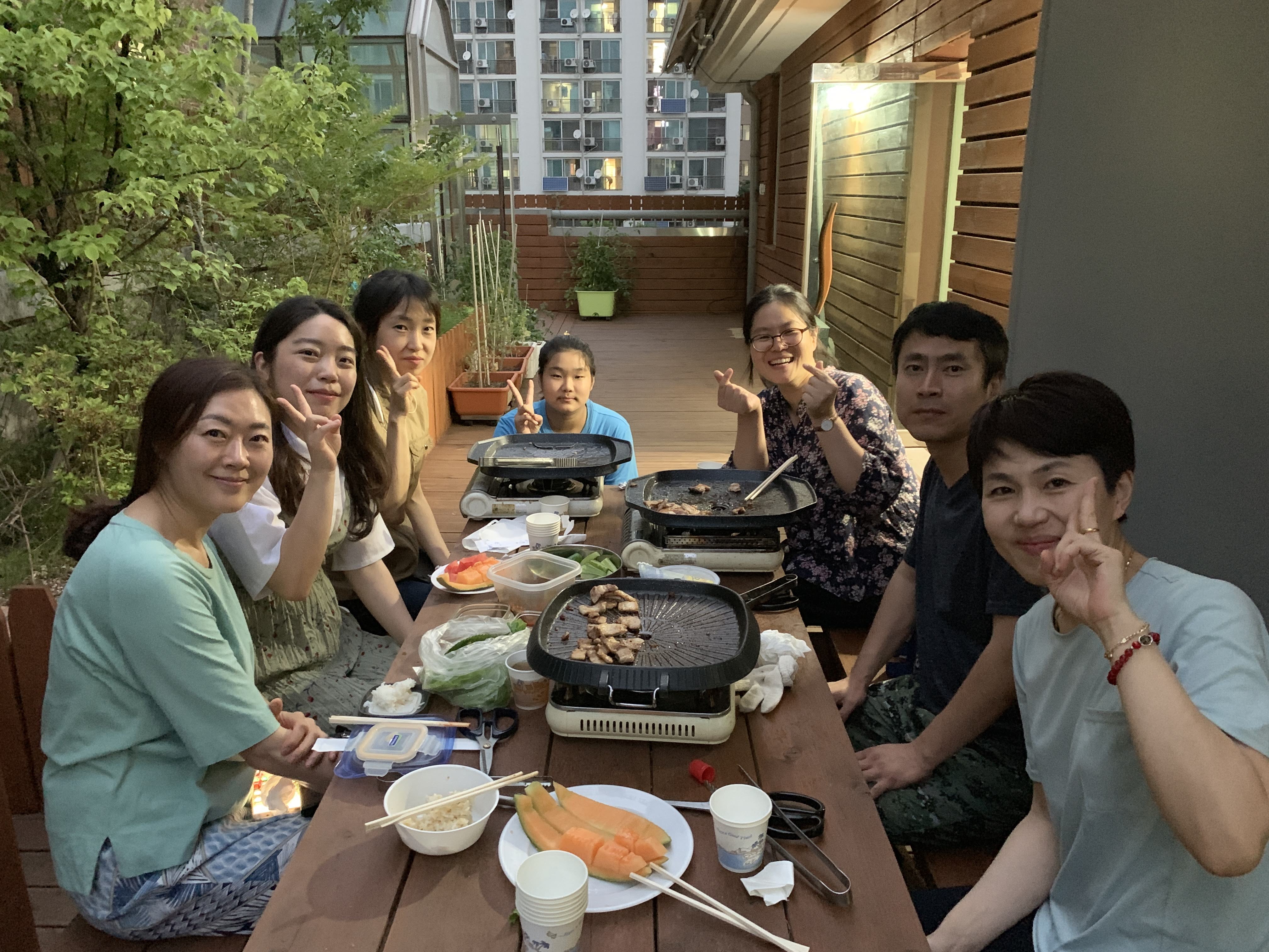 부모님들이 고기 구우시며 자연스럽게 대화 나누셨습니다.
