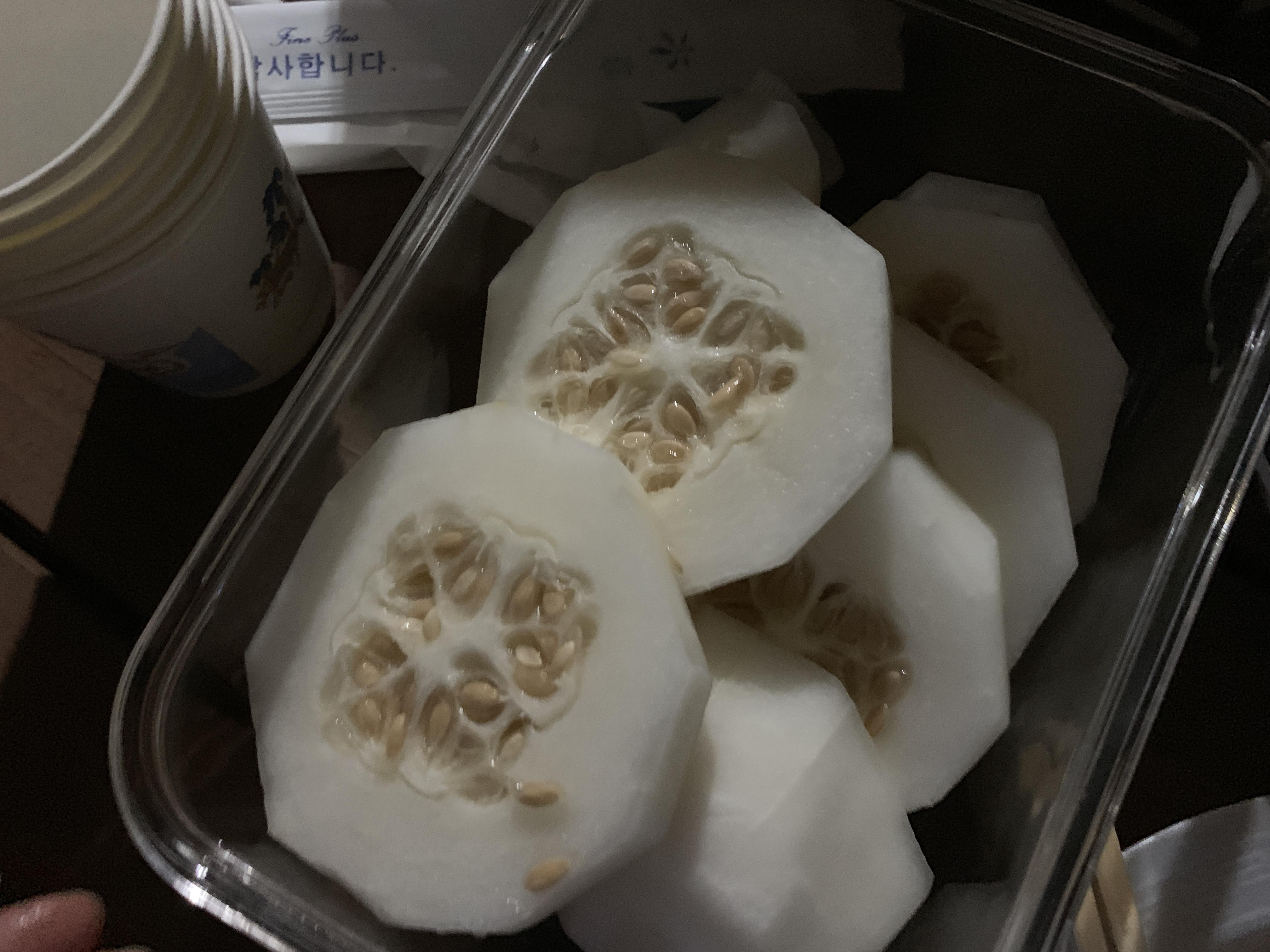 정우네 상추, 깻잎, 배추김치, 윤이네 메론, 수박이 상에 차려졌습니다.