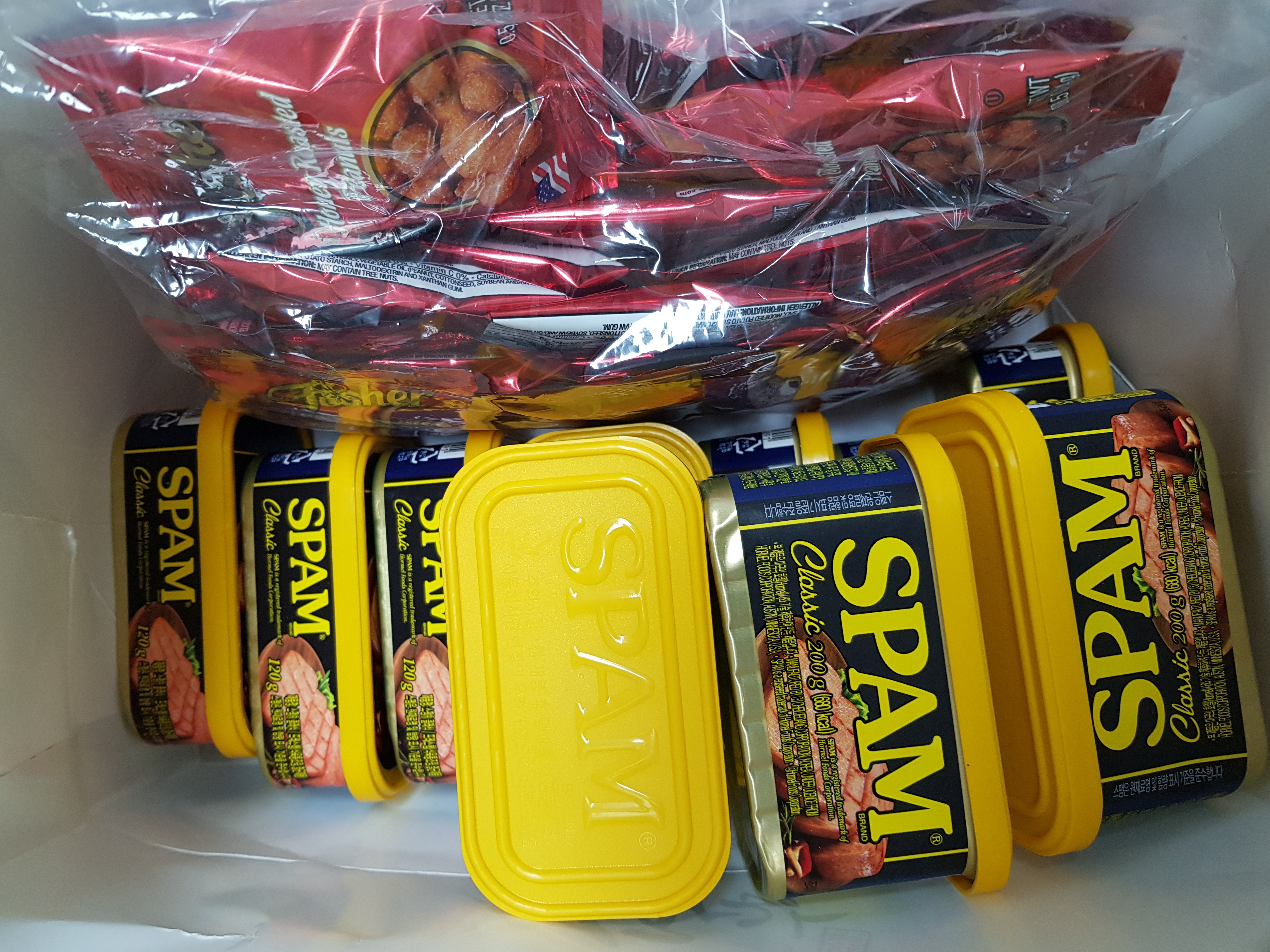 통조림 햄, 땅콩 과자가 가득 들어있어 무엇인지 물었습니다.