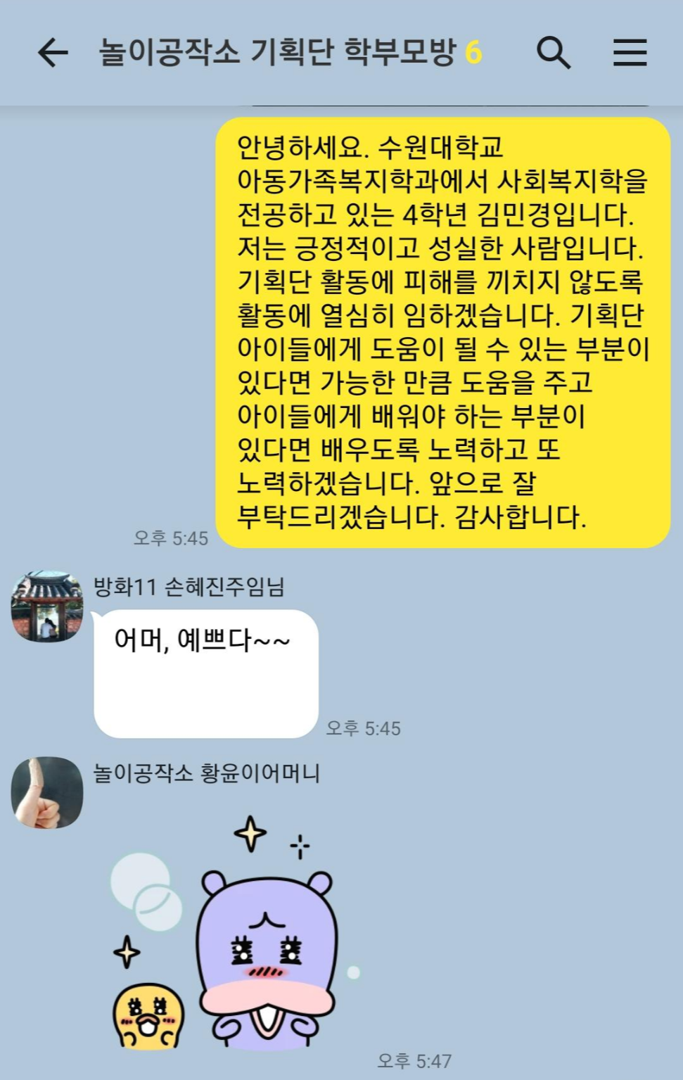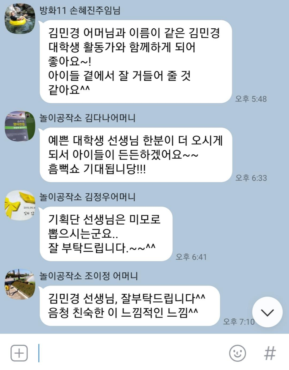 기획단 학부모님들과 모여있는 채팅방에 올리니 힘껏 환영해주셨습니다.