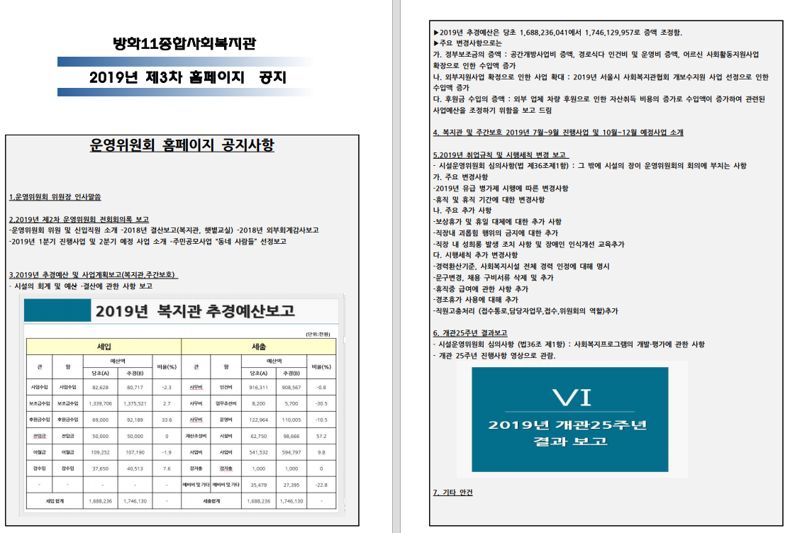 2019년도 3차 방화11종합사회복지관 운영위원회가 진행되었습니다.