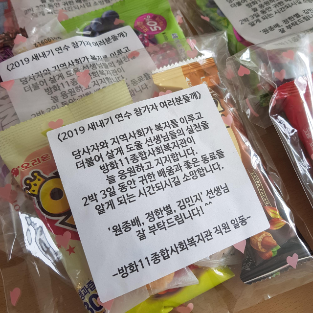 직원분들께서 조금씩 모아 연수에 참여하는 새내기 모두 같이 먹을 다과를 준비해주신 겁니다. 우리 복지관 신입 선생님들 잘 부탁드린다는 작은 문구와 함께요.