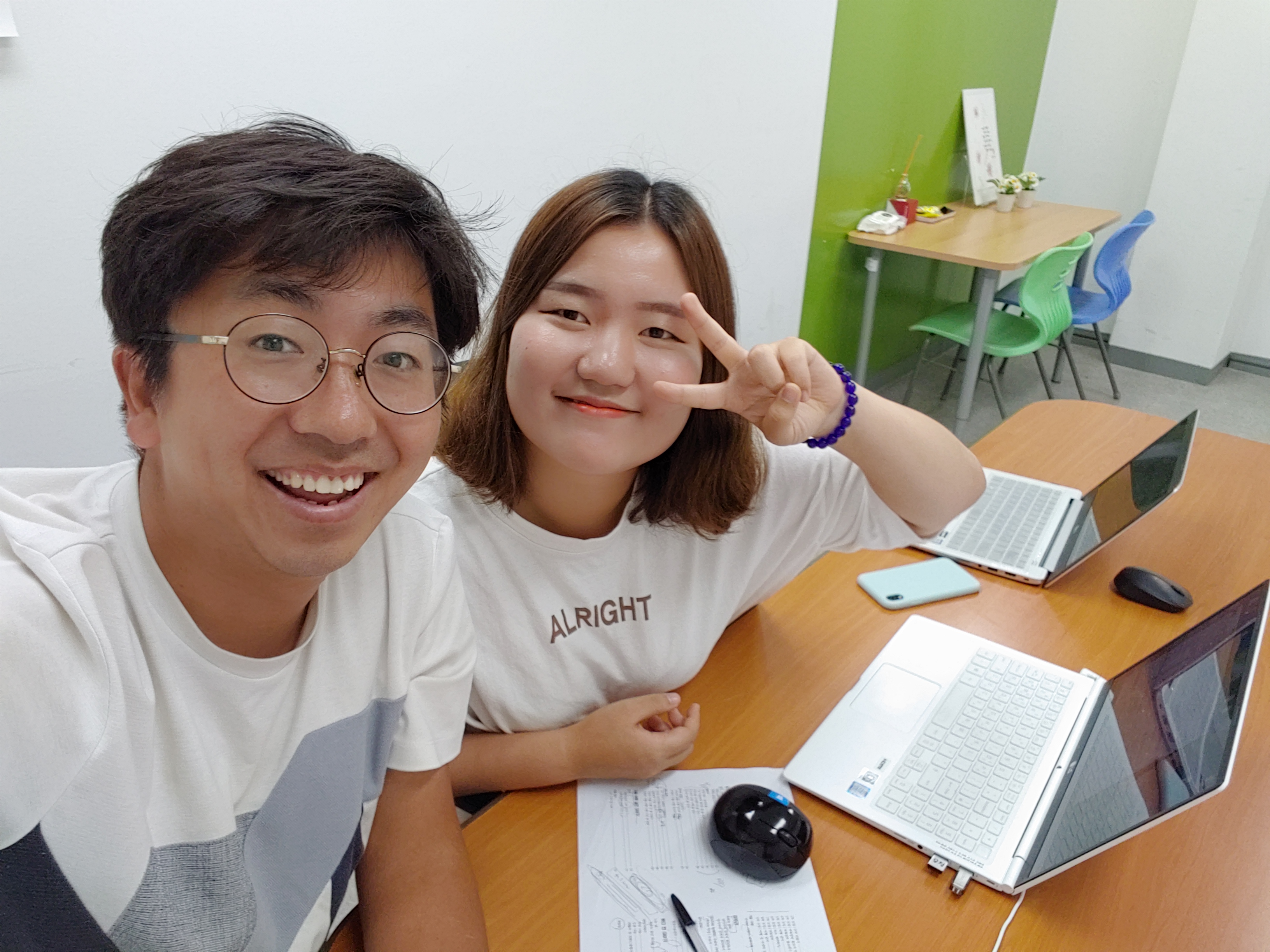 세경과 예림은 복지관으로 와서 함께 글을 다듬고 있습니다.