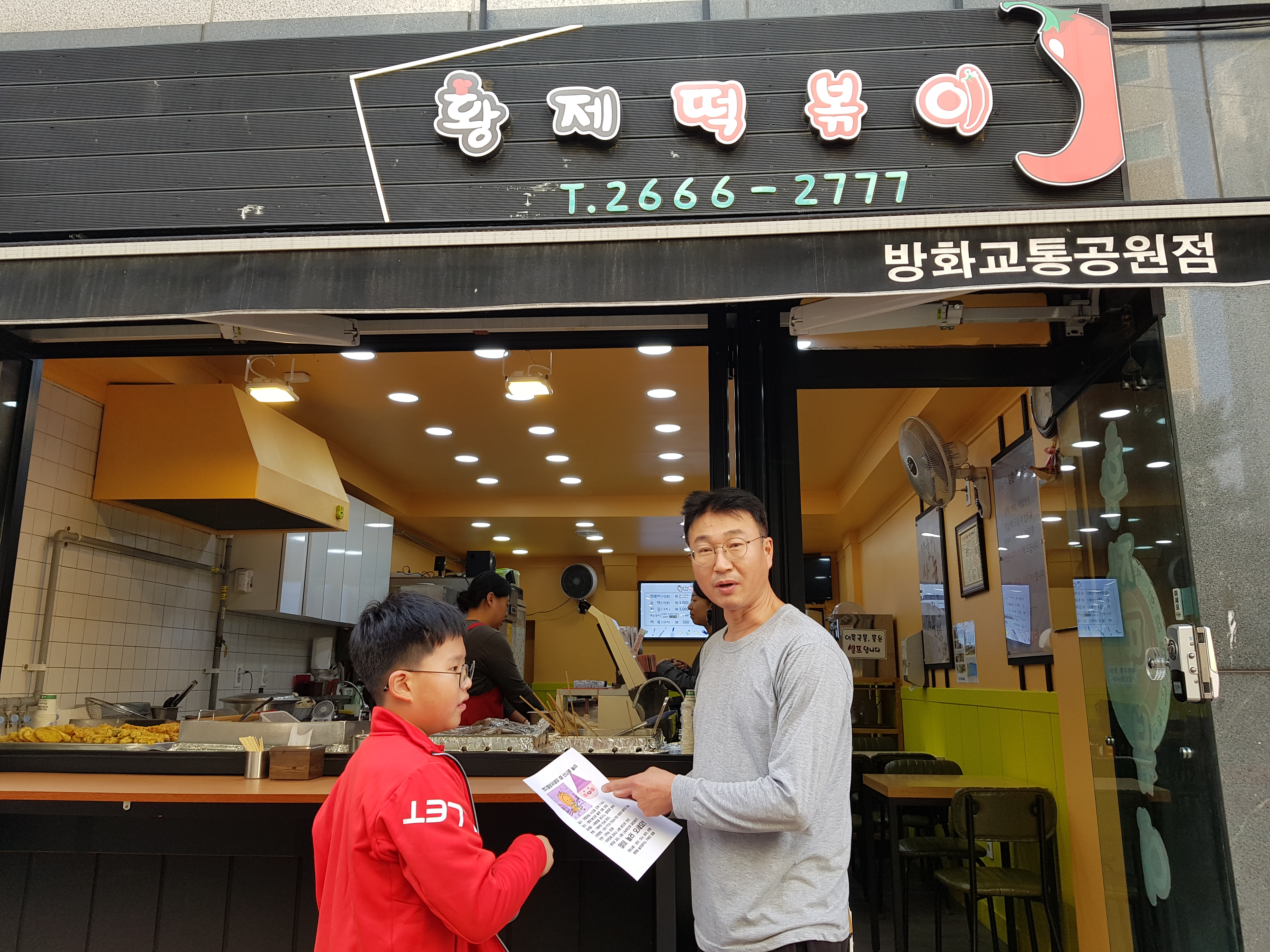 아이들이 와와문구에 있는 사이 정우가 급하게 뛰어가 홍보지를 붙여달라고 부탁드렸습니다.