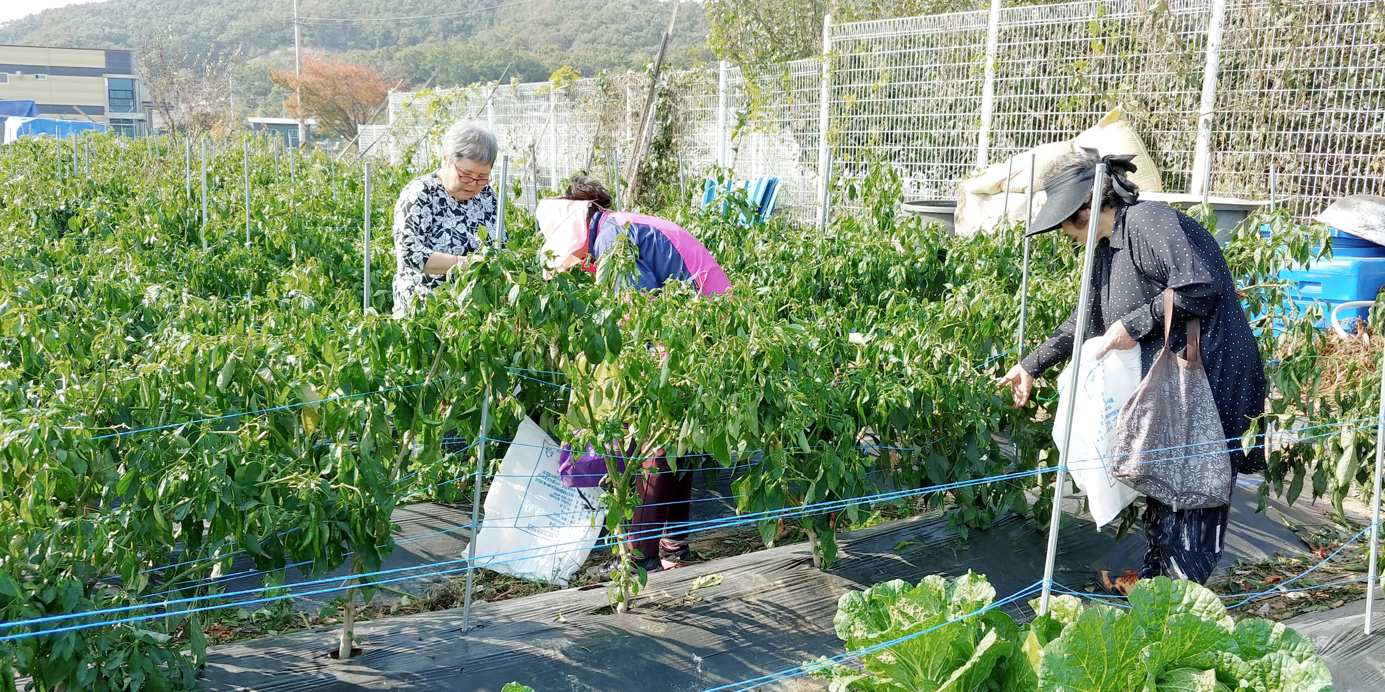 풀꽃향기 회원들이 마을텃밭(싱싱텃밭과 나눔터텃밭)에서 수확한