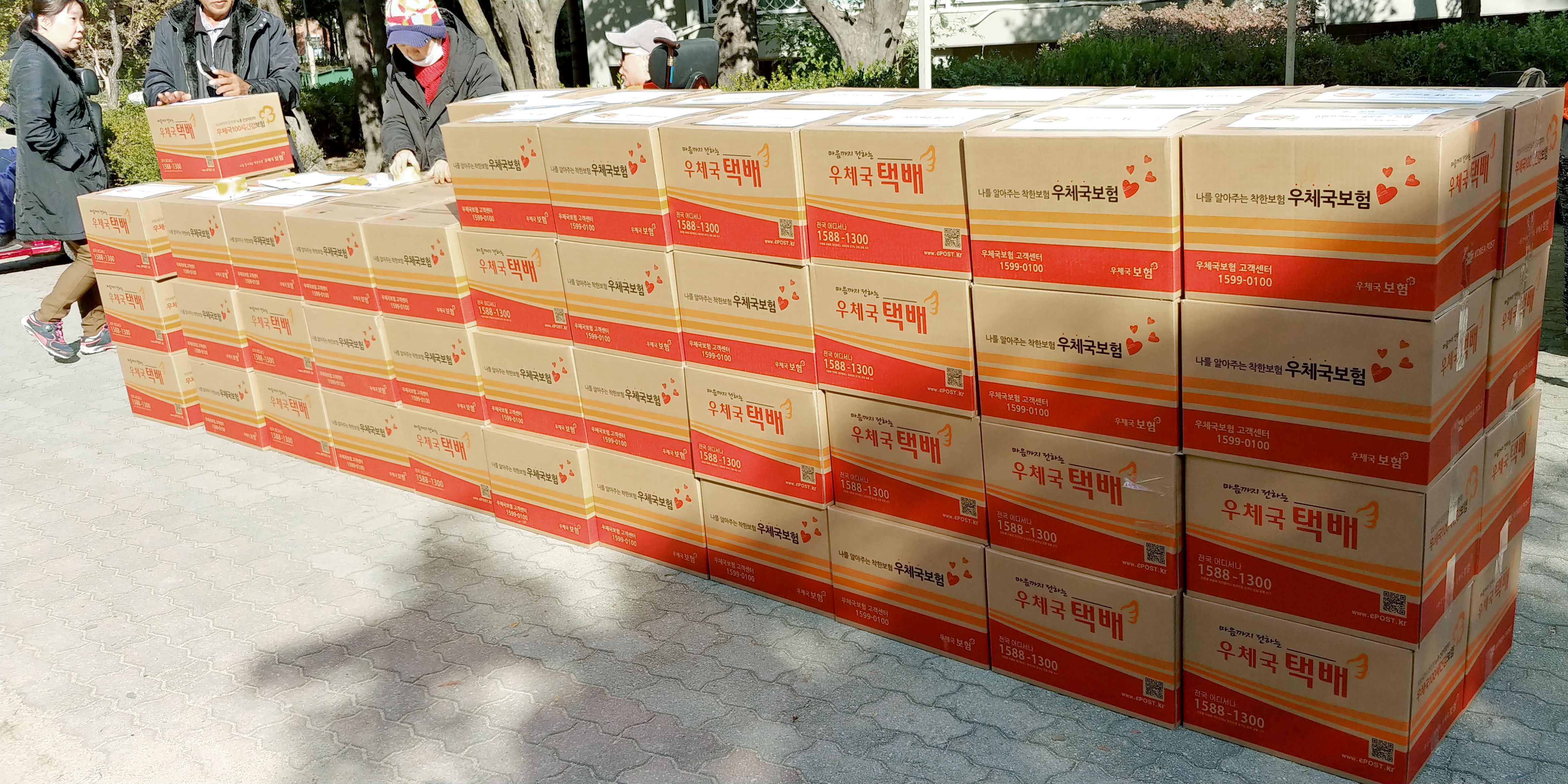 그리고 장애인 등 이웃들에게 나눠드릴 김장김치 박스도 80개 분량을 테이프를 붙여가며 만들었습니다.