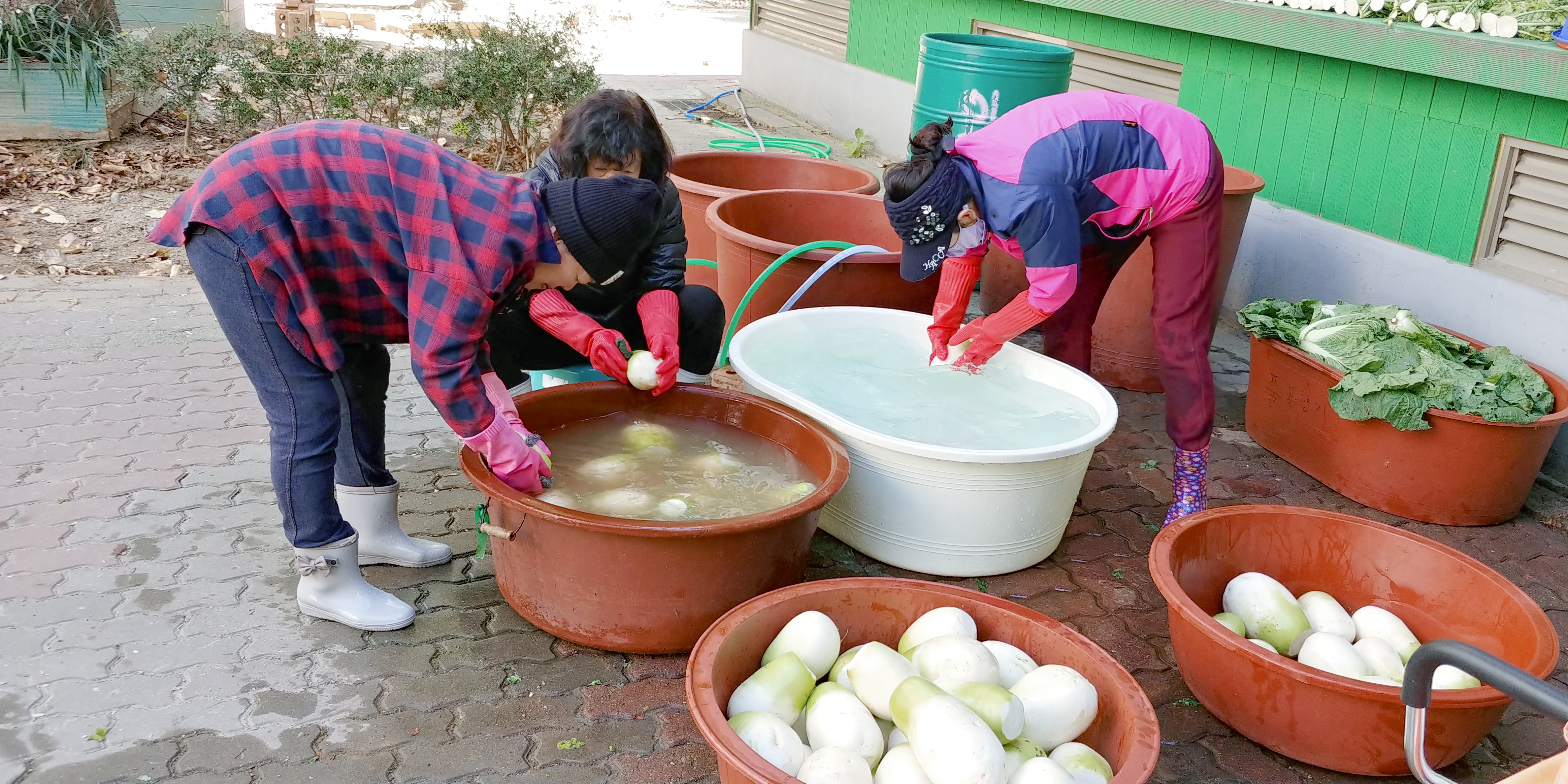 오늘은 절인 배추를 깨끗하게 헹구는 날입니다.