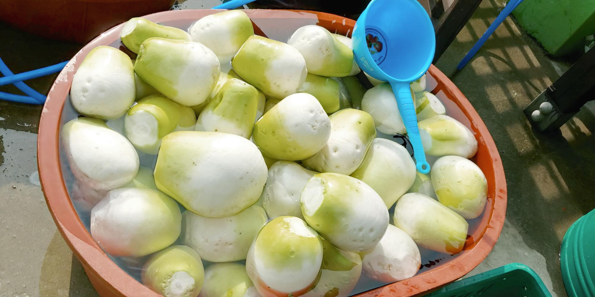 깨끗하게 씻은 무를 사등분하여 자루에 담아 놓는 작업도 진행합니다.