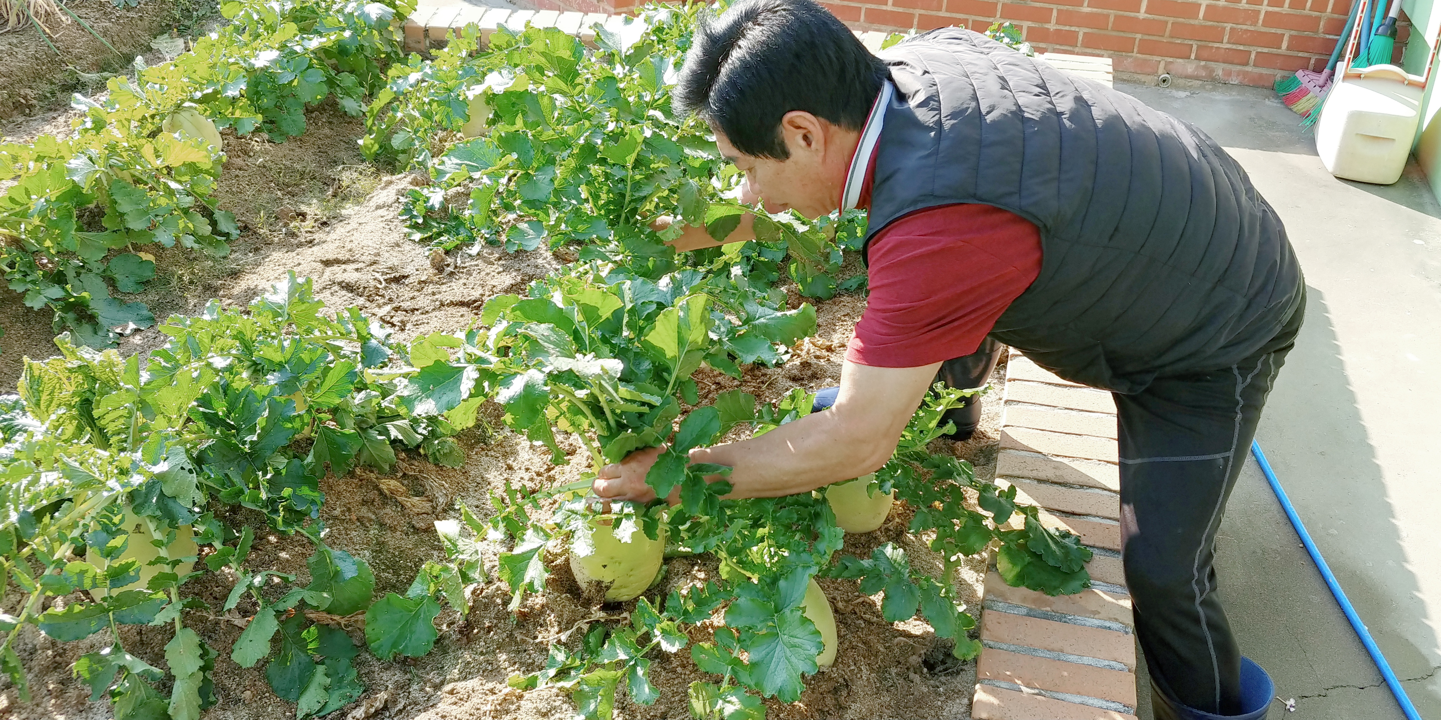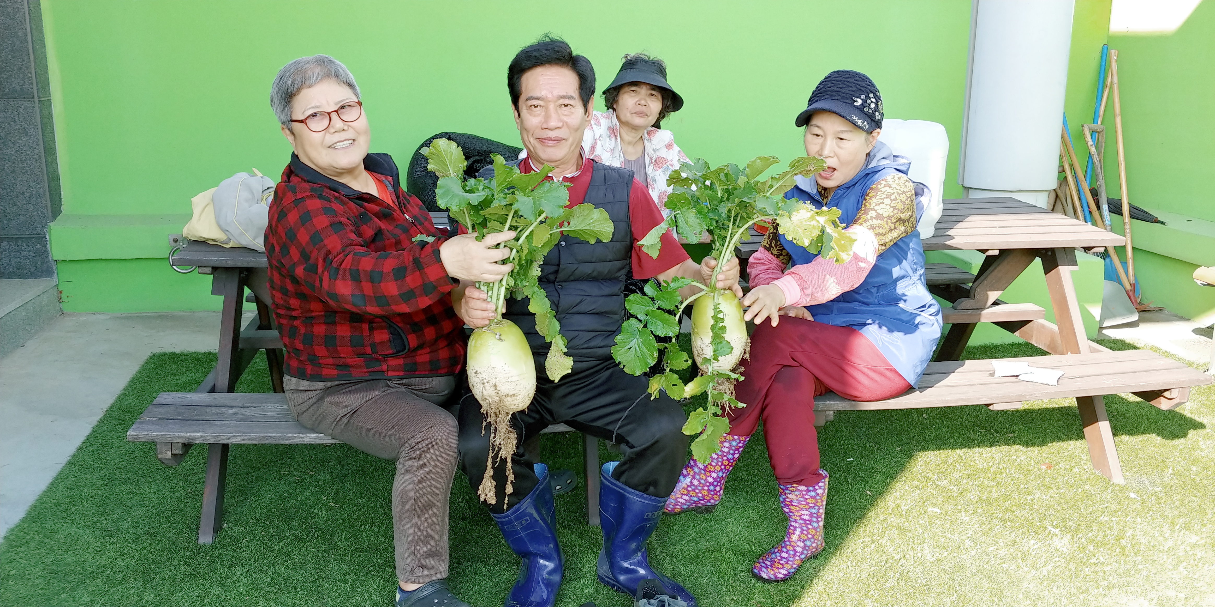 복지관 싱싱텃밭에서 정성껏 재배한 유기농 배추와 무를 수확하였어요.