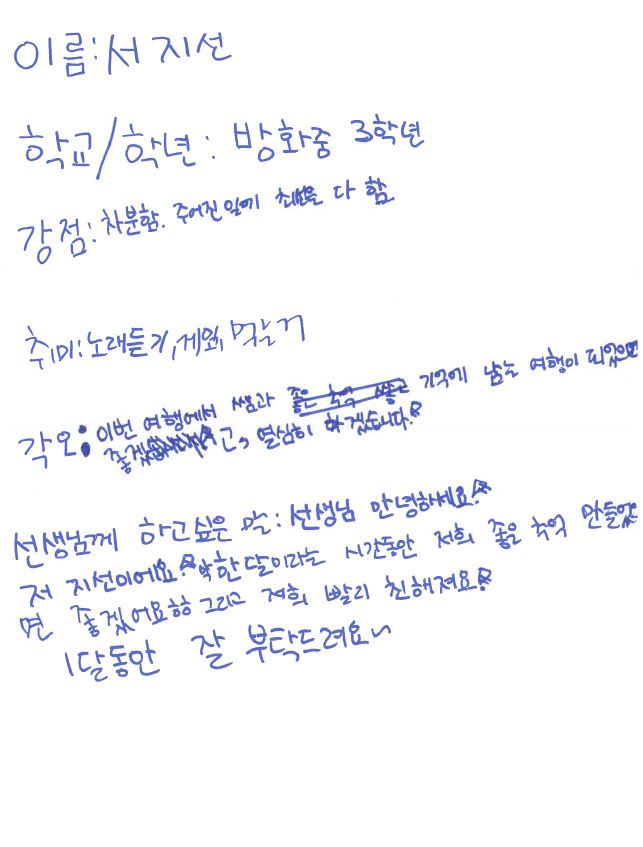 강점, 취미, 각오, 선생님께 하고 싶은 말을 썼습니다.