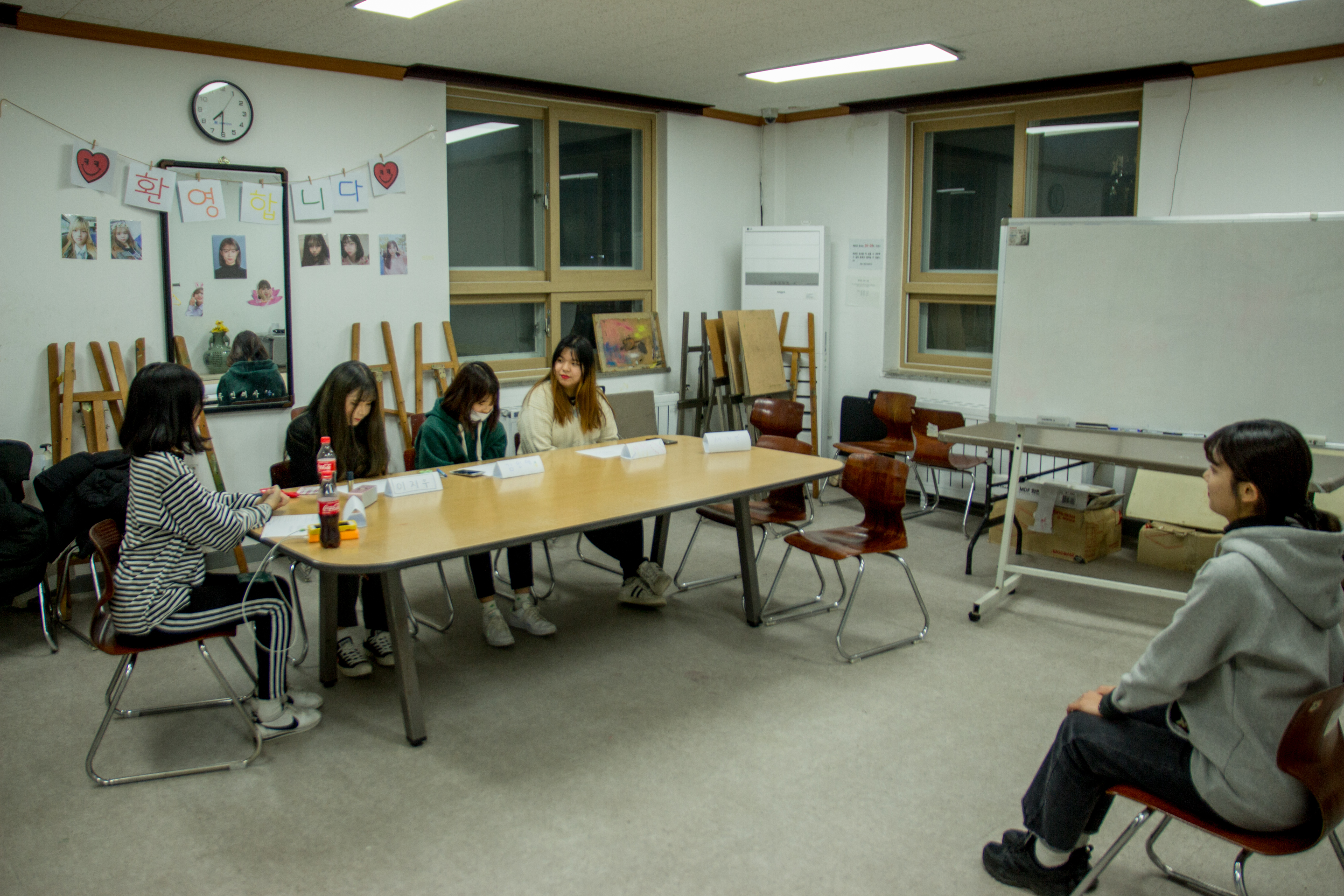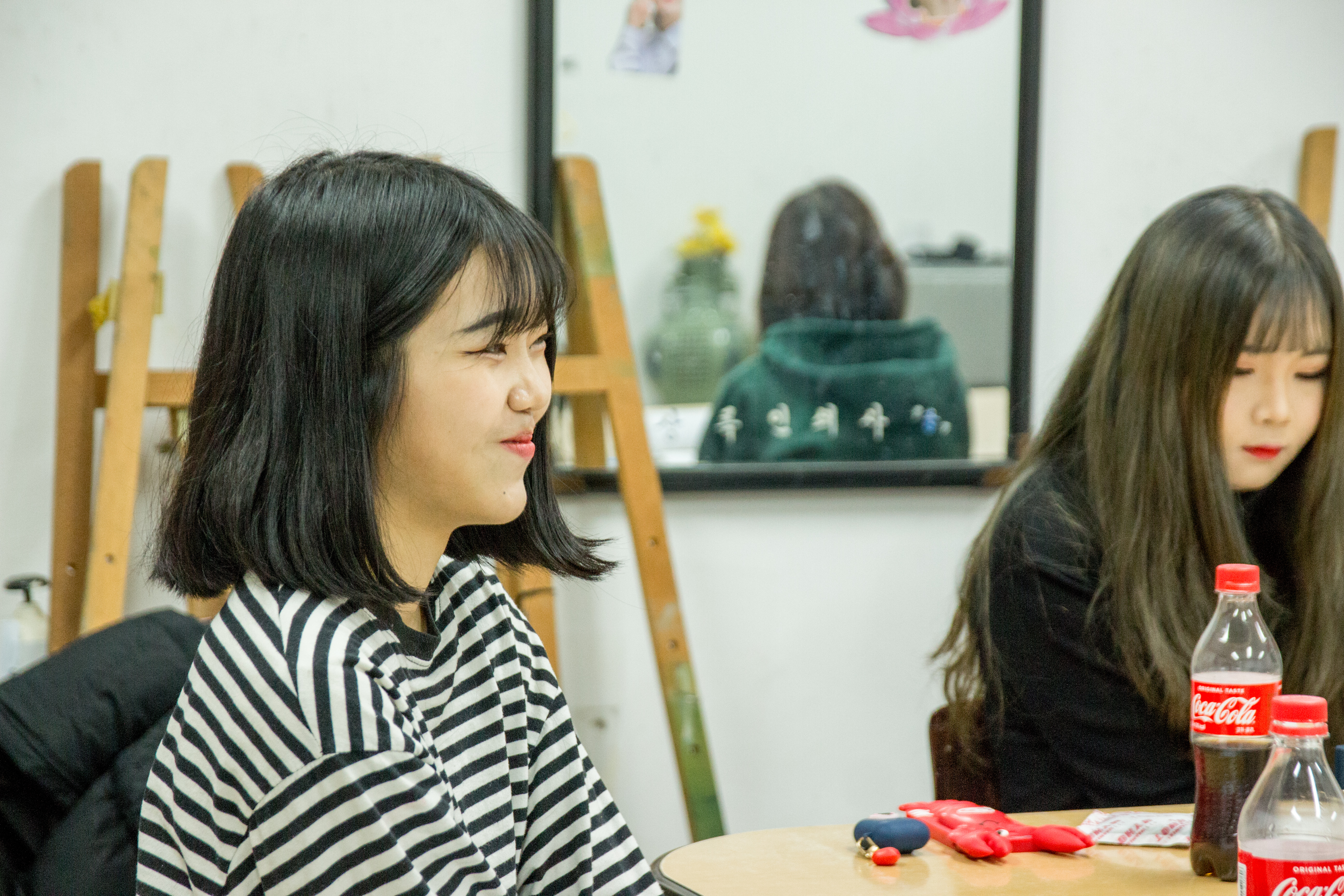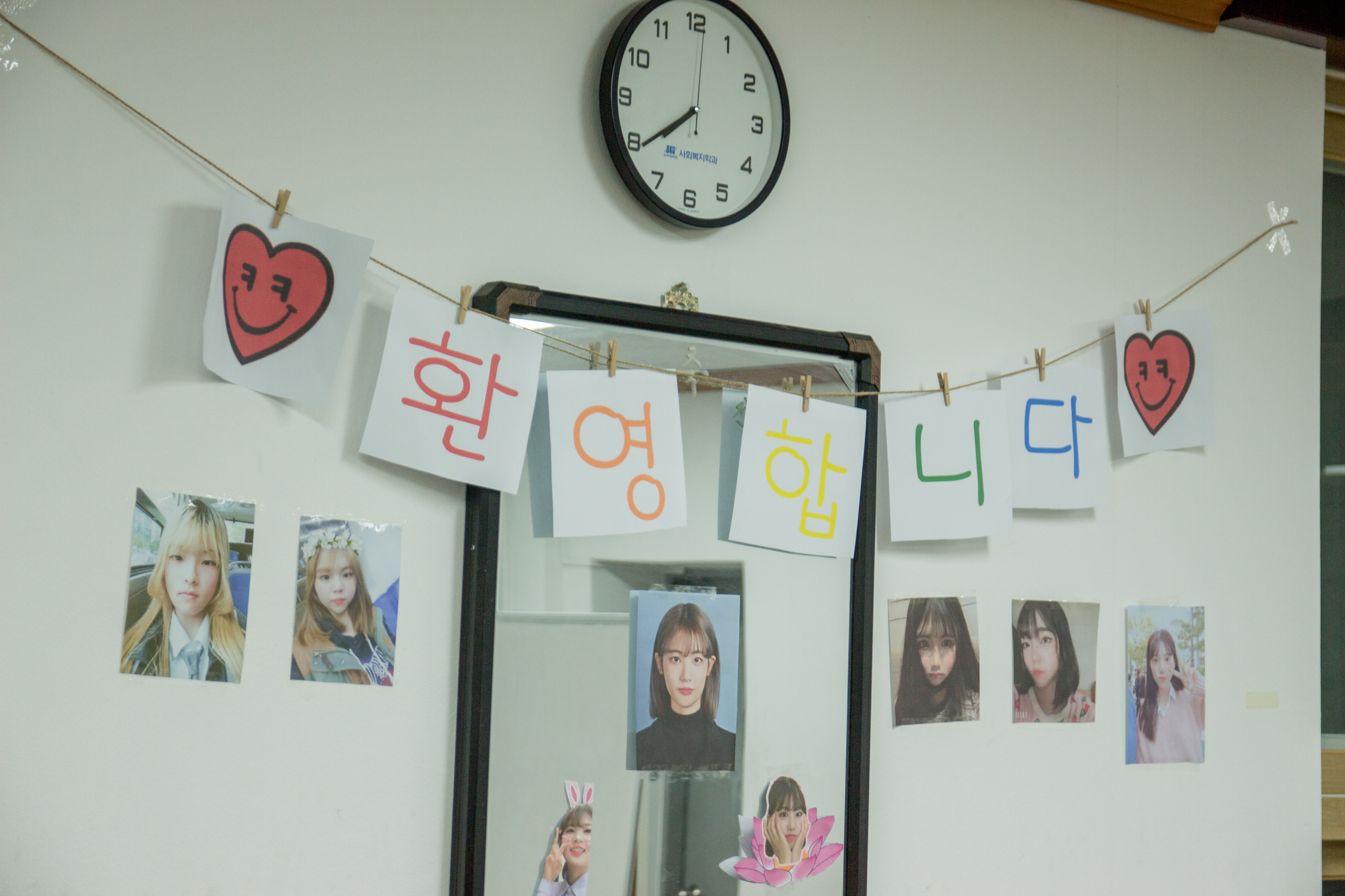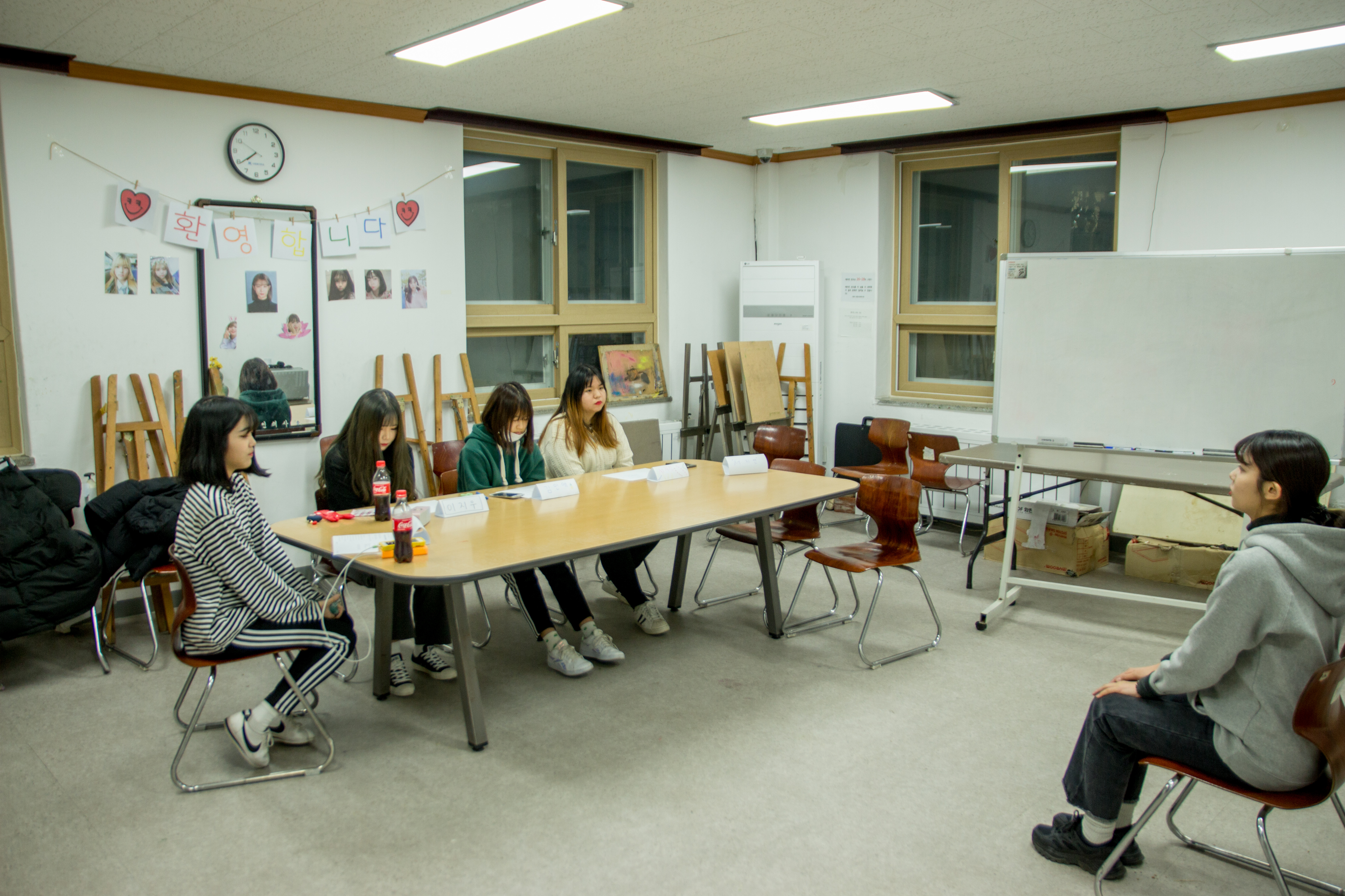 언니들이 오기 전에 지선과 인애가 면접실을 꾸몄습니다.