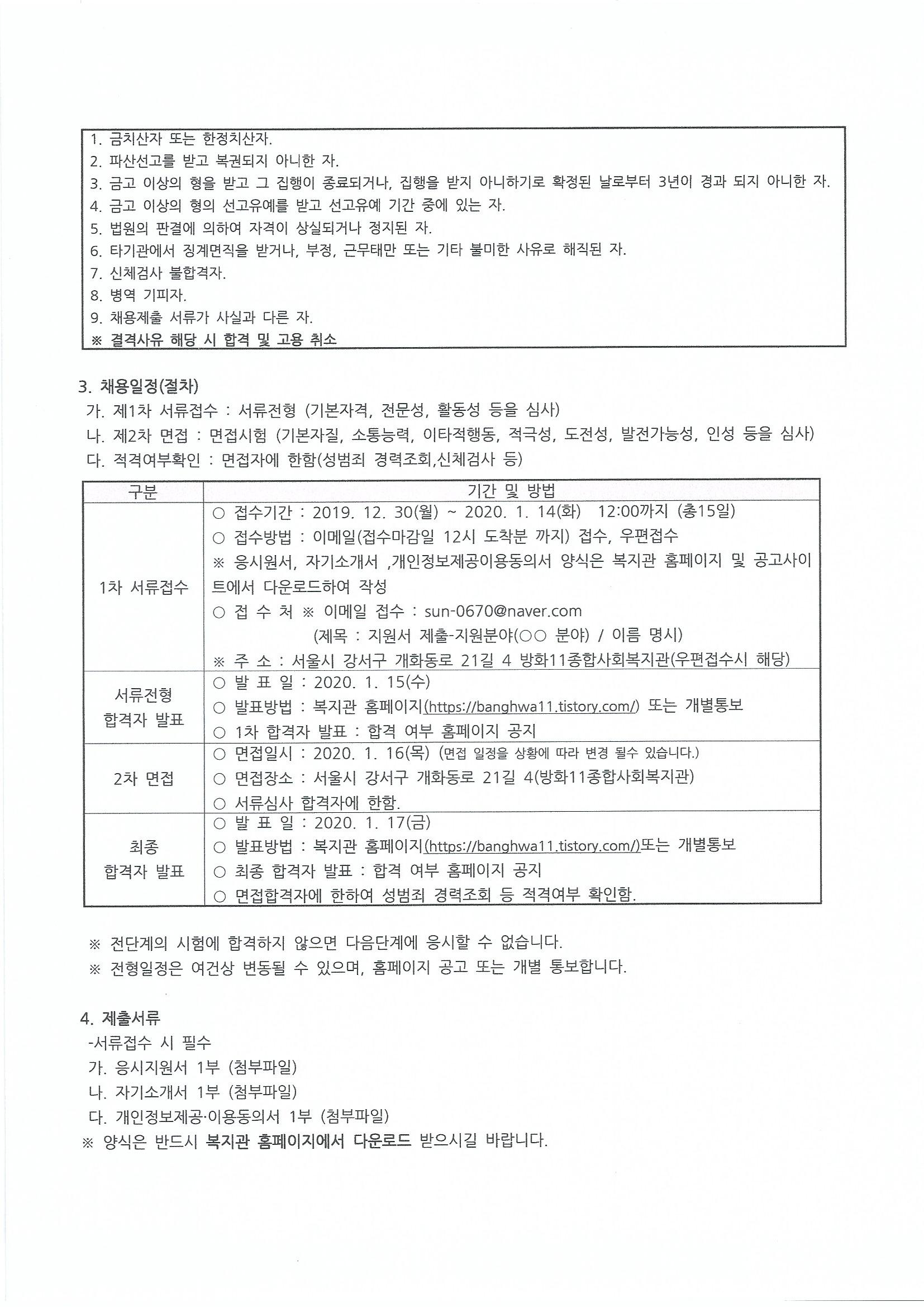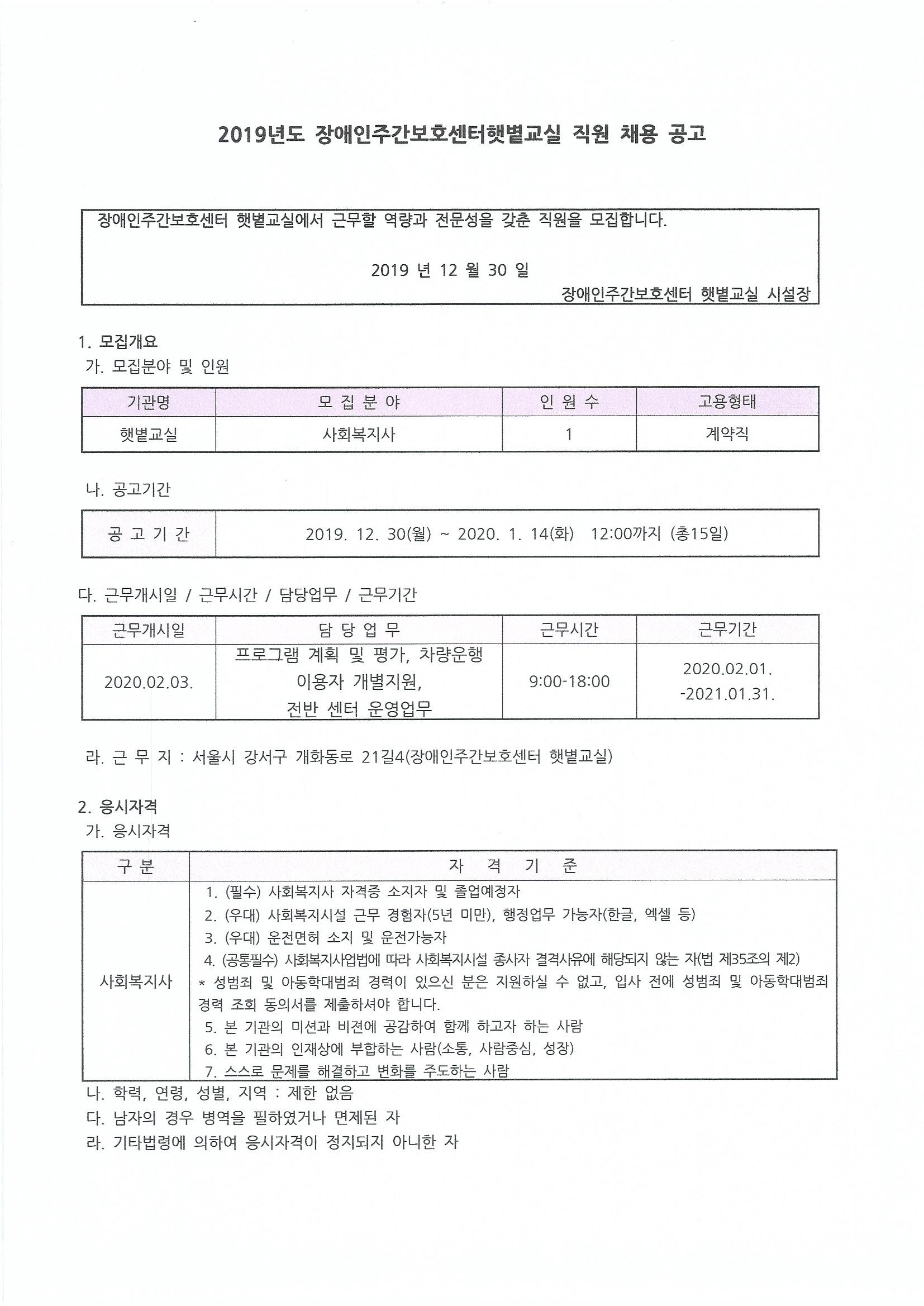 장애인주간보호센터햇볕교실 사회복지사 채용 공고 카테고리 없음 2019. 12. 30. 10:04 사회복지사- 채용(햇볕_최종).zip 0.56MB 장애인 주간보호센터 햇볕교실에서는 산전후휴가 및 육아휴직 대체에 따른 사회복지사를 채용하고니 많은 관심과 지원 바랍니다. 공유하기 게시글 관리 방화11종합사회복지관 저작자표시 (새창열림) 댓글