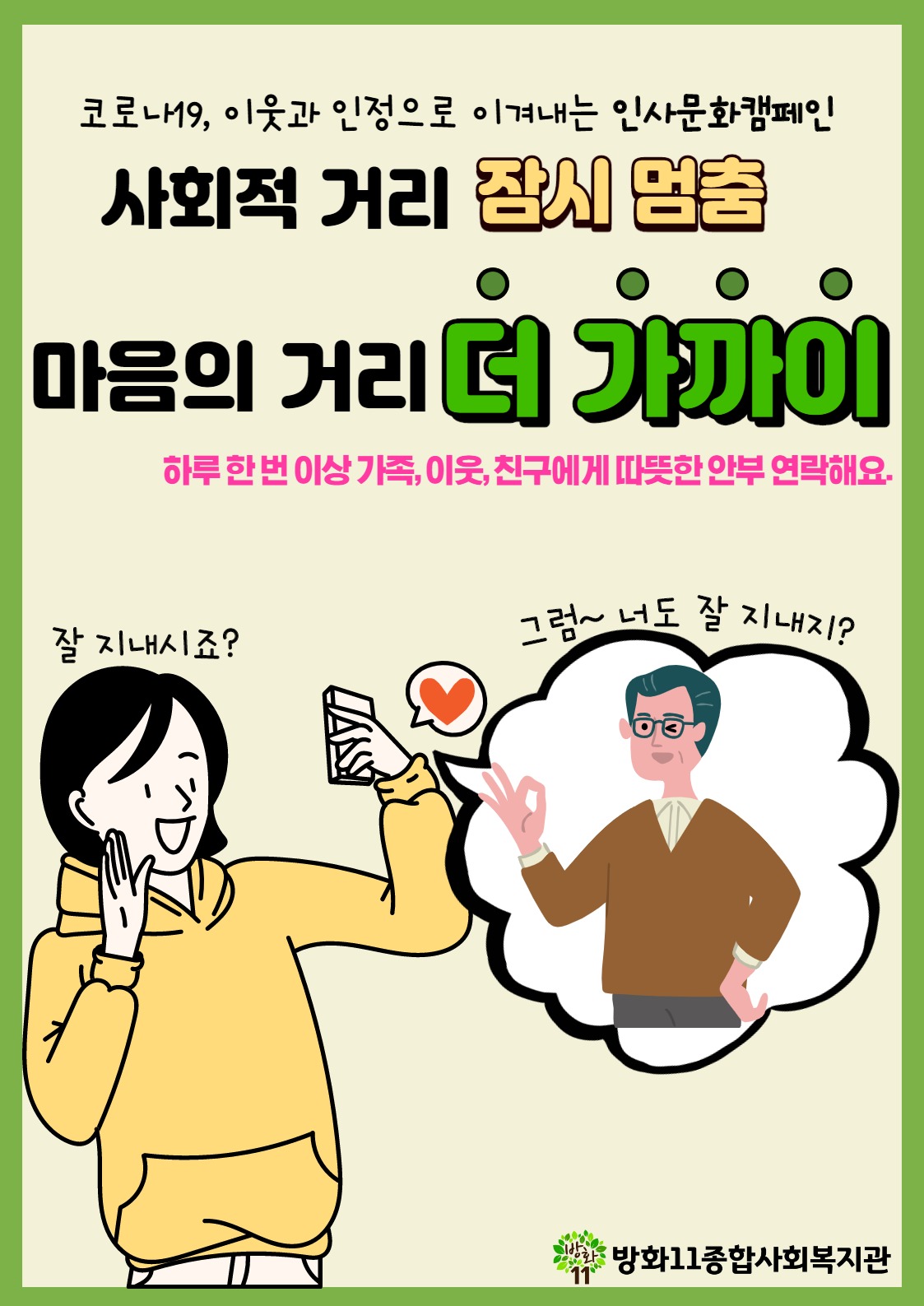 가족‧이웃‧친구에게 하루 한 번 이상 따뜻한 안부 한마디를 전하며 서로를 응원하면 어떨까요?