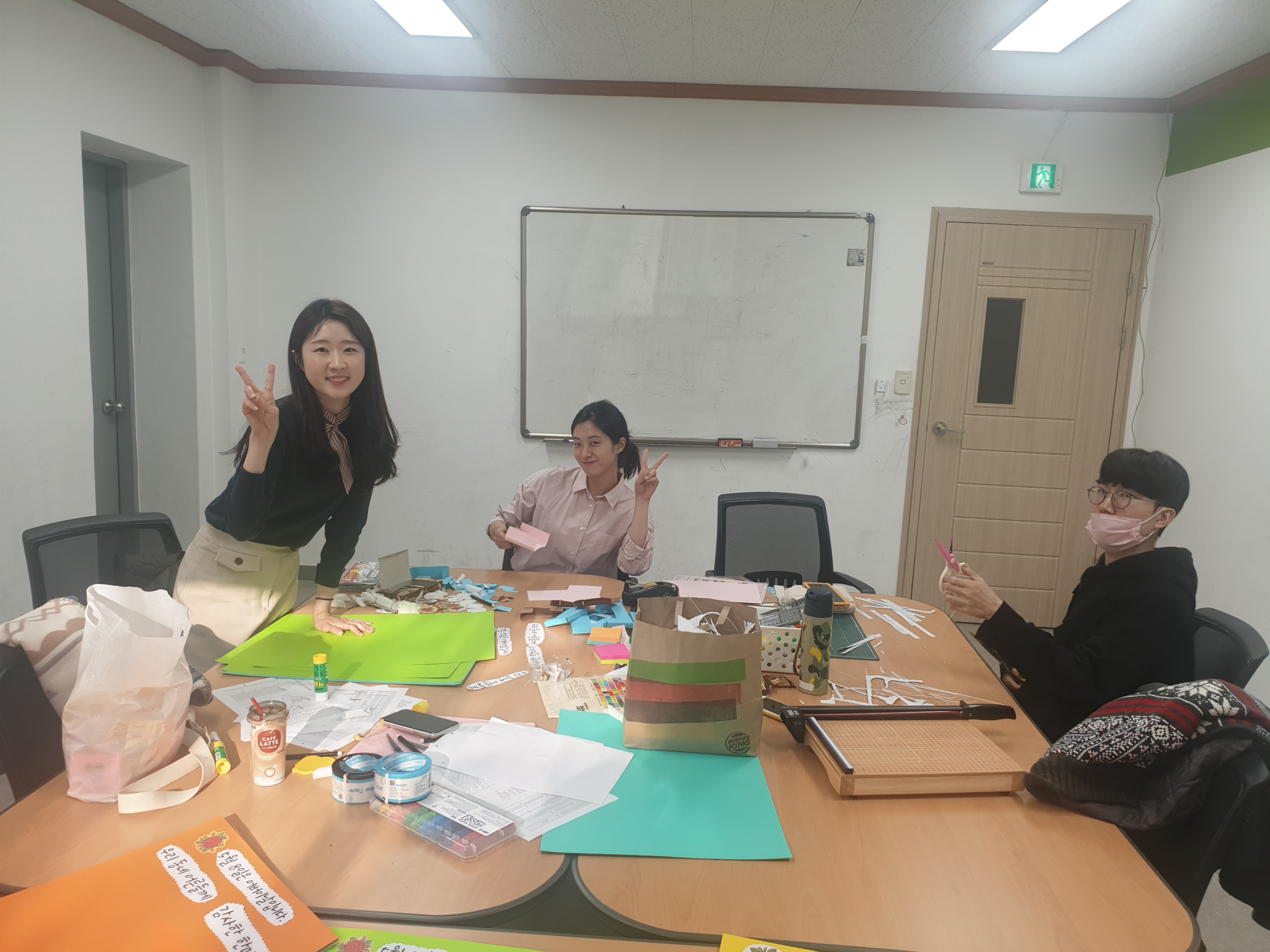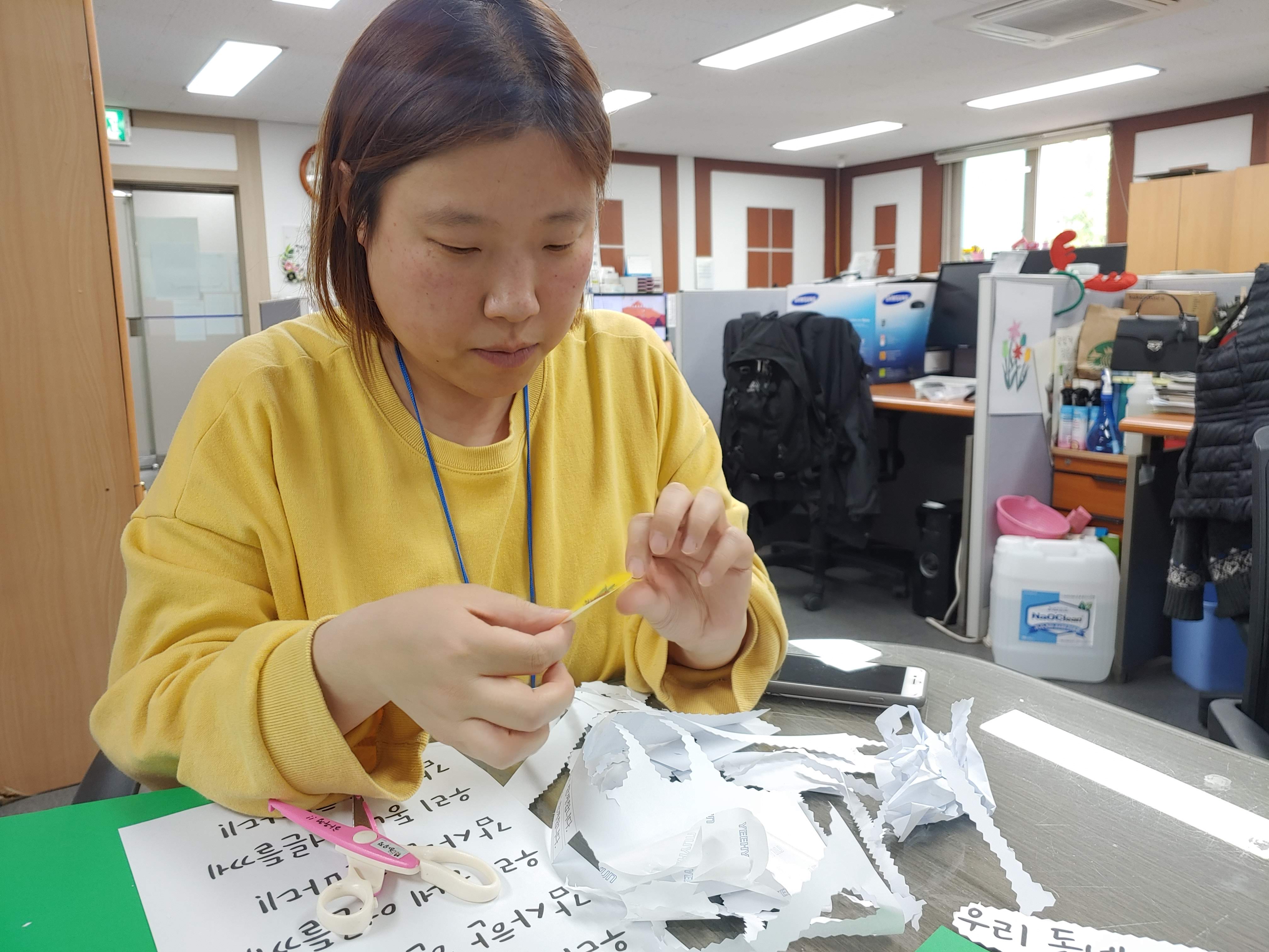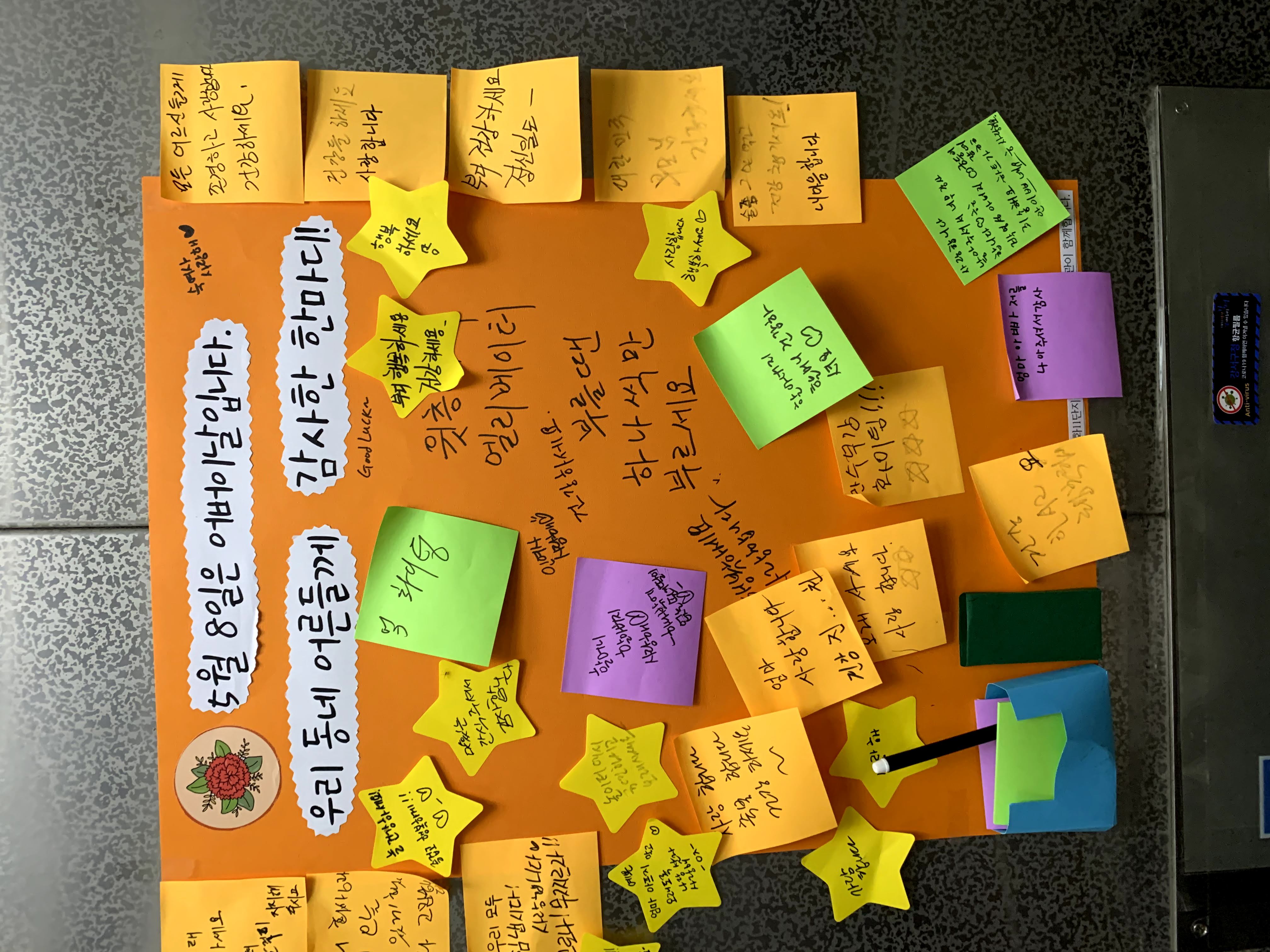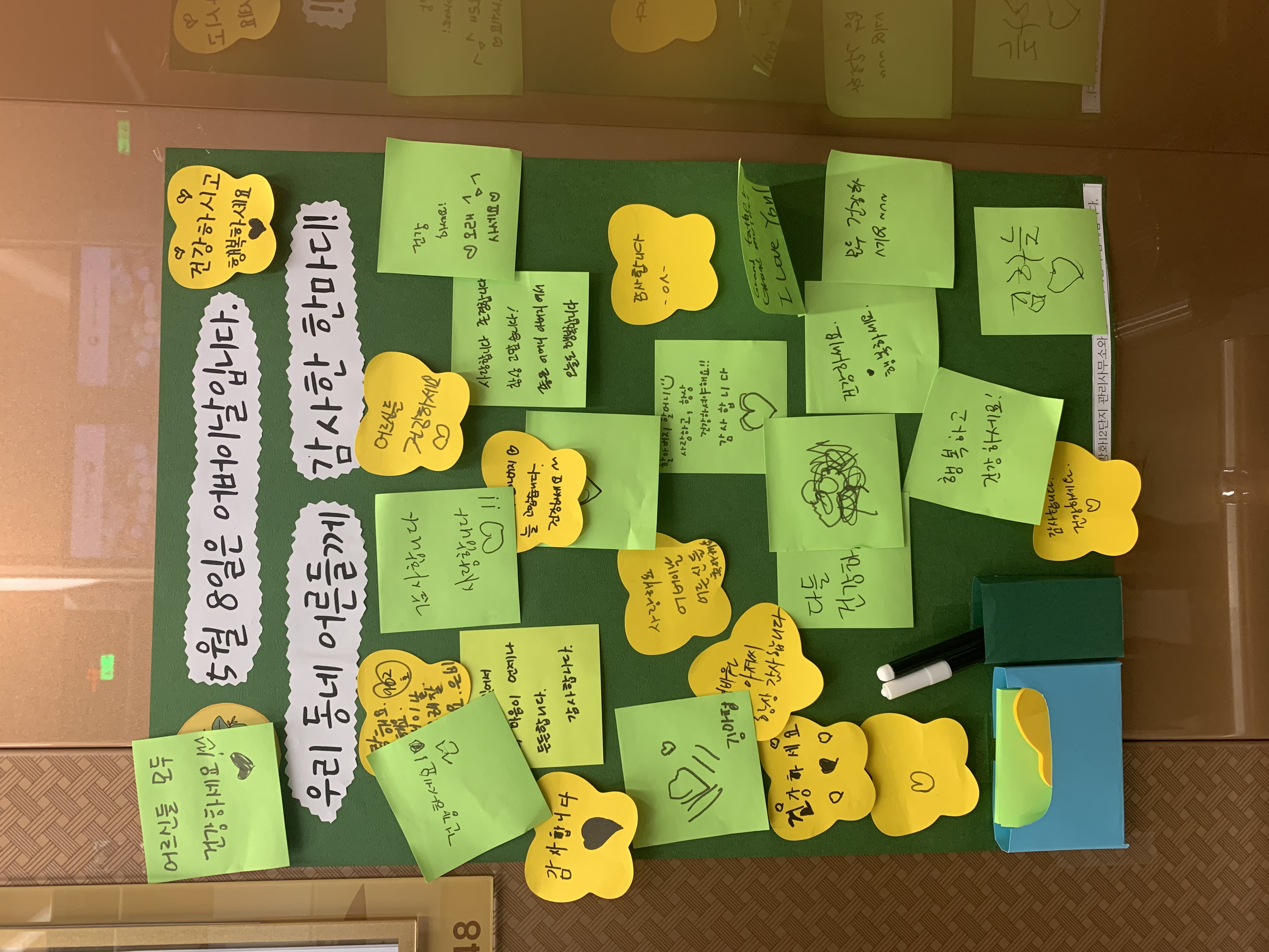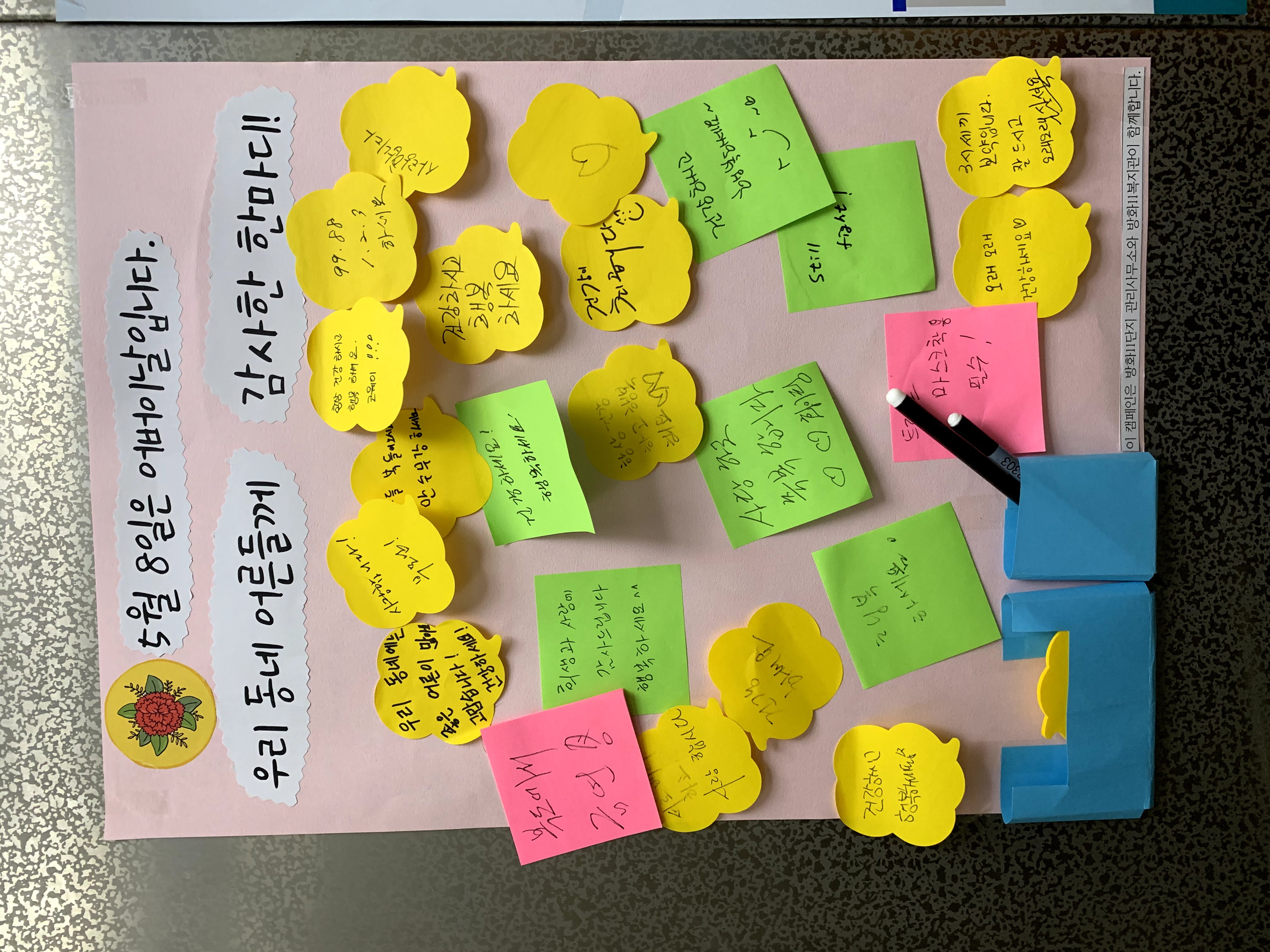 우리 동네 어른에게 전하는 감사 한마디를 나눌 붙임쪽지판을 만들었습니다. 하우정 정한별 김민지 선생님이 물품을 구매했습니다. 다함께 조금씩 시간을 내어 붙임쪽지판을 만들었습니다. 붙임쪽지와 싸이펜을 넣을 상자도 만들었습니다. 화사하고 예쁩니다. 팀 동료들의 솜씨에 깜짝 놀랐습니다. 승강기를 타면 눈에 바로 들어오고 글을 쓰고 싶어 질 겁니다. 붙임쪽지판을 만들며 동료와 두런두런 이야기 나누는 시간도 즐거웠습니다. 물론 입은 말하지만 손은 쉬면 안된다고 서로를 다독였습니다.