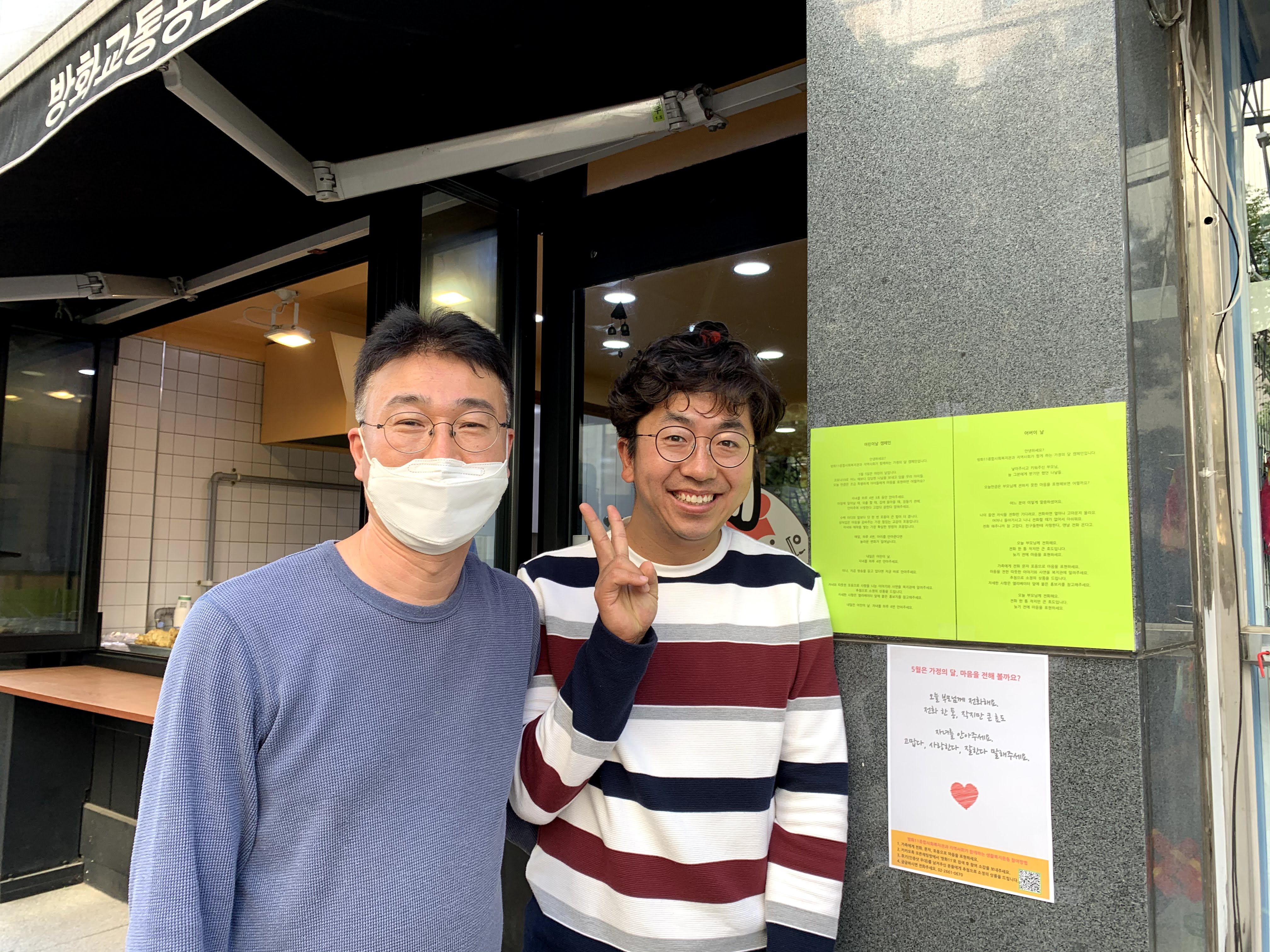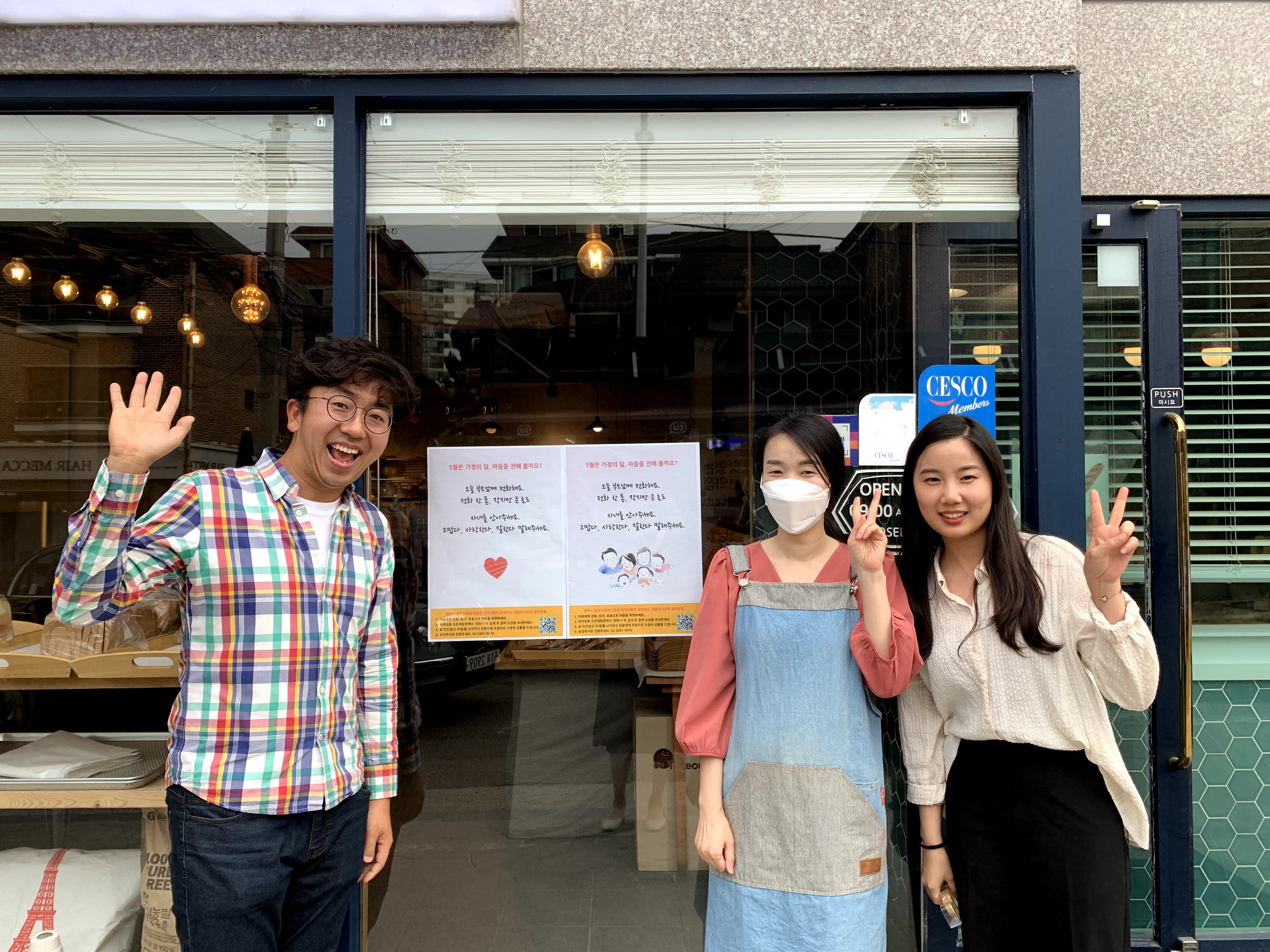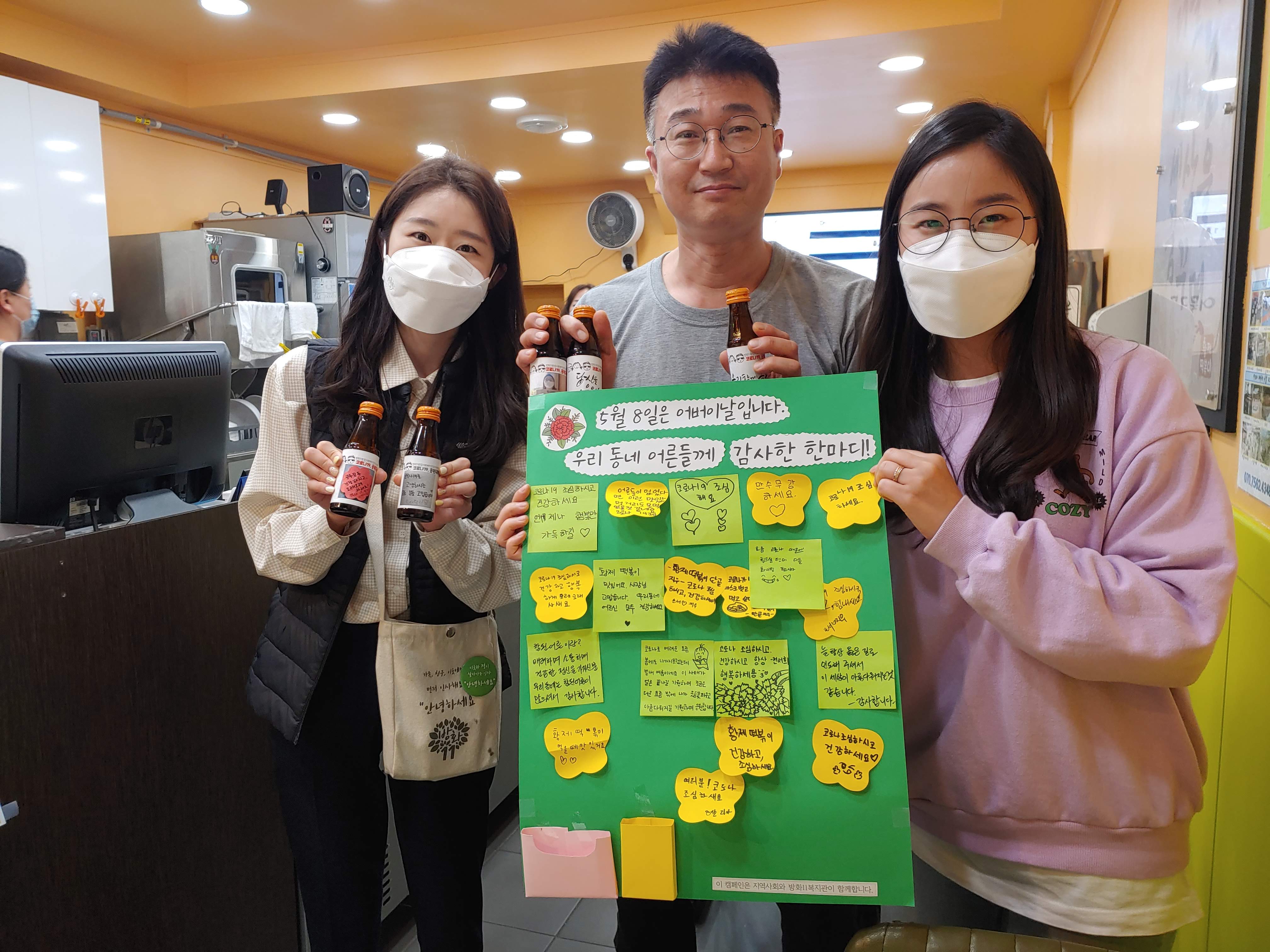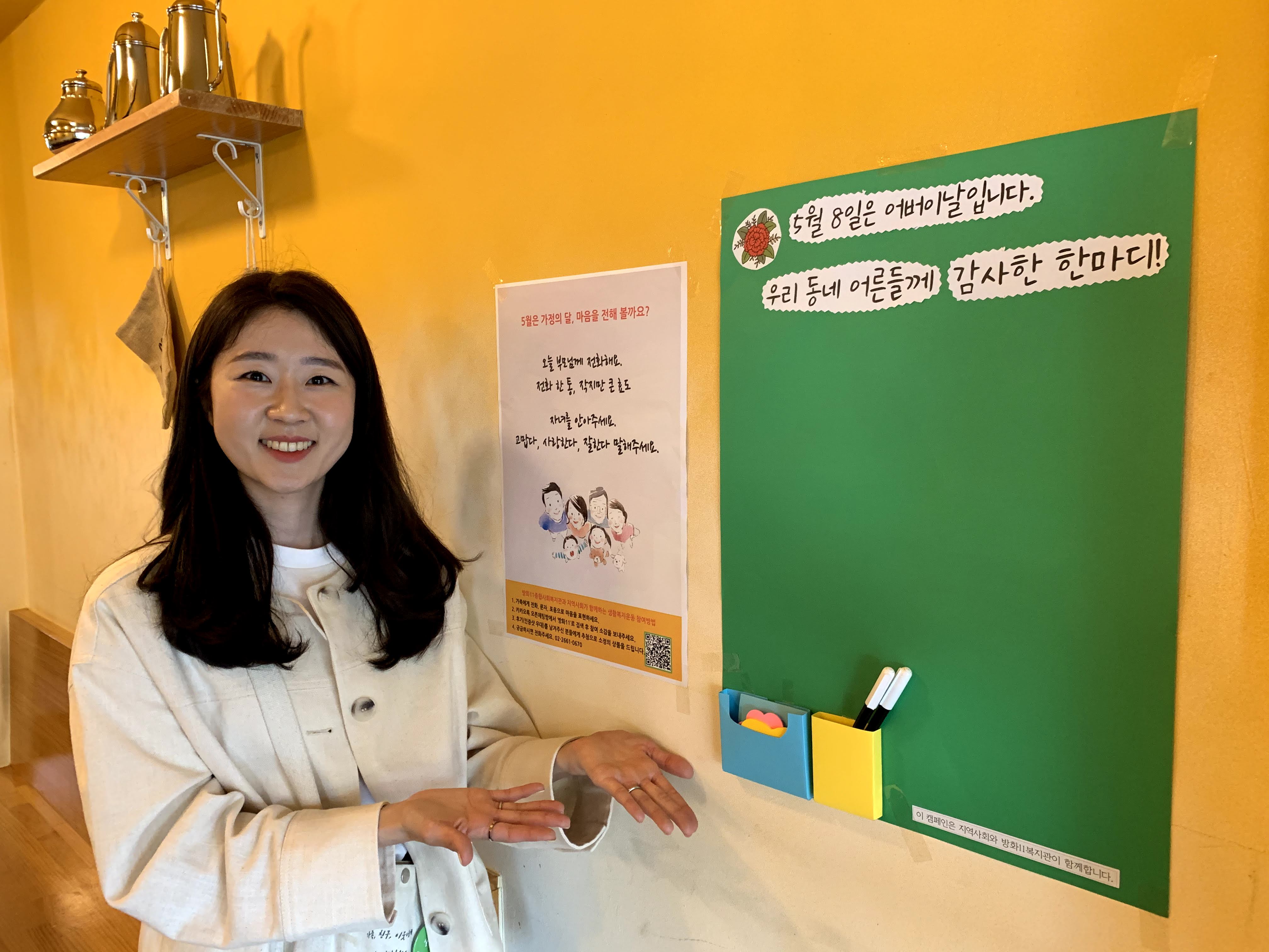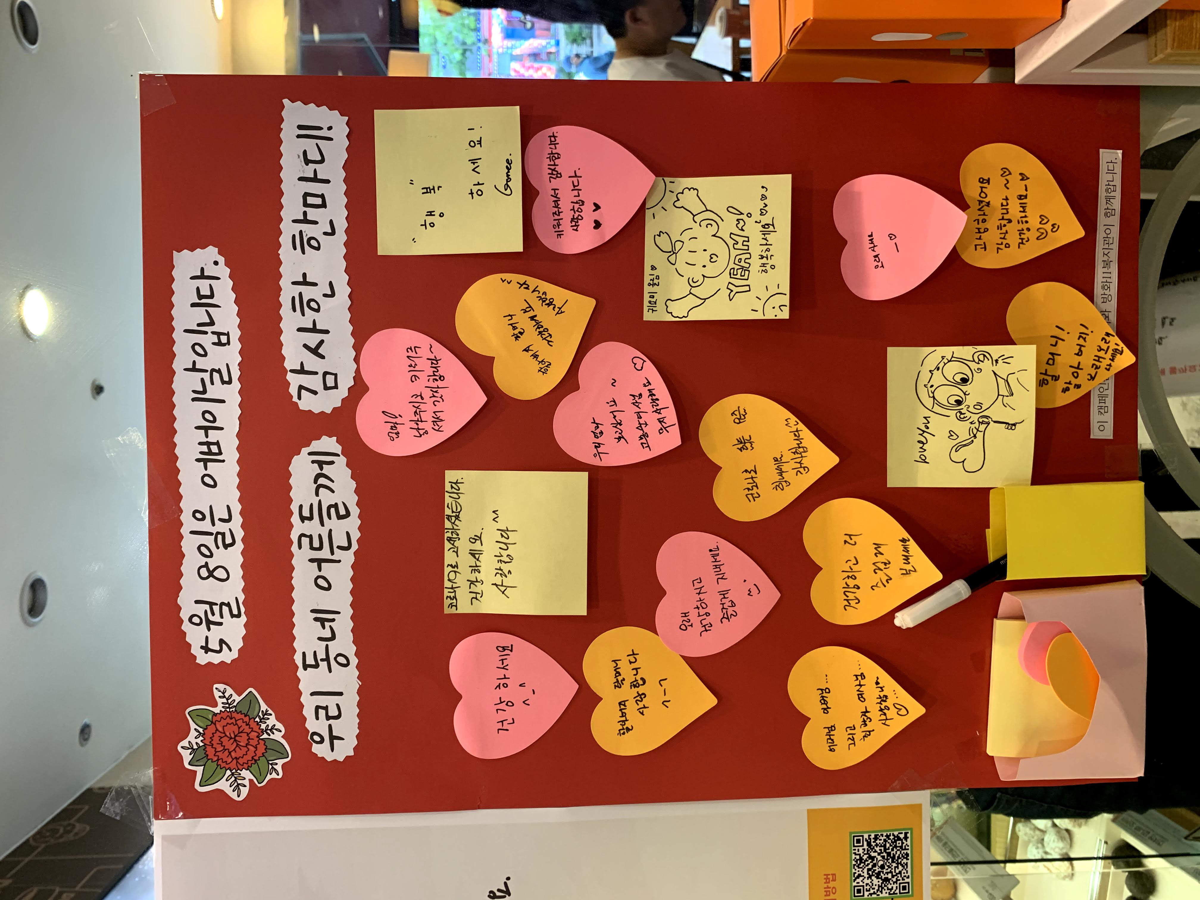 “그럼요, 고맙습니다. 가게에 들어오는 손님이 이 붙임쪽지판을 보고 마음이 따뜻하고 부드러워지기를 바라요. 이를 구실로 사장님과 손님, 가족와 이웃이 서로 감사한 마음을 표현하기를 바라요. 함께해주셔서 고맙습니다.”