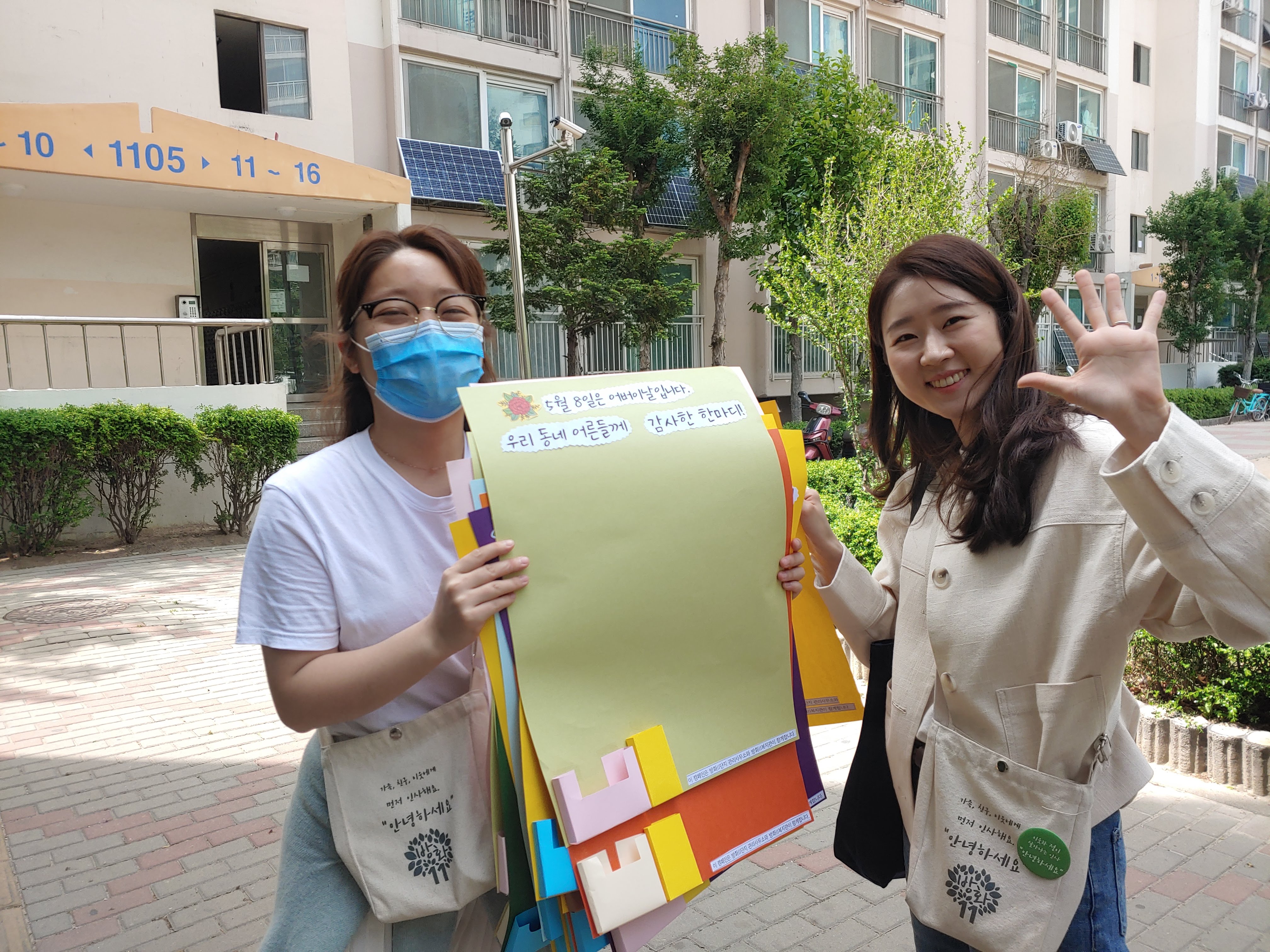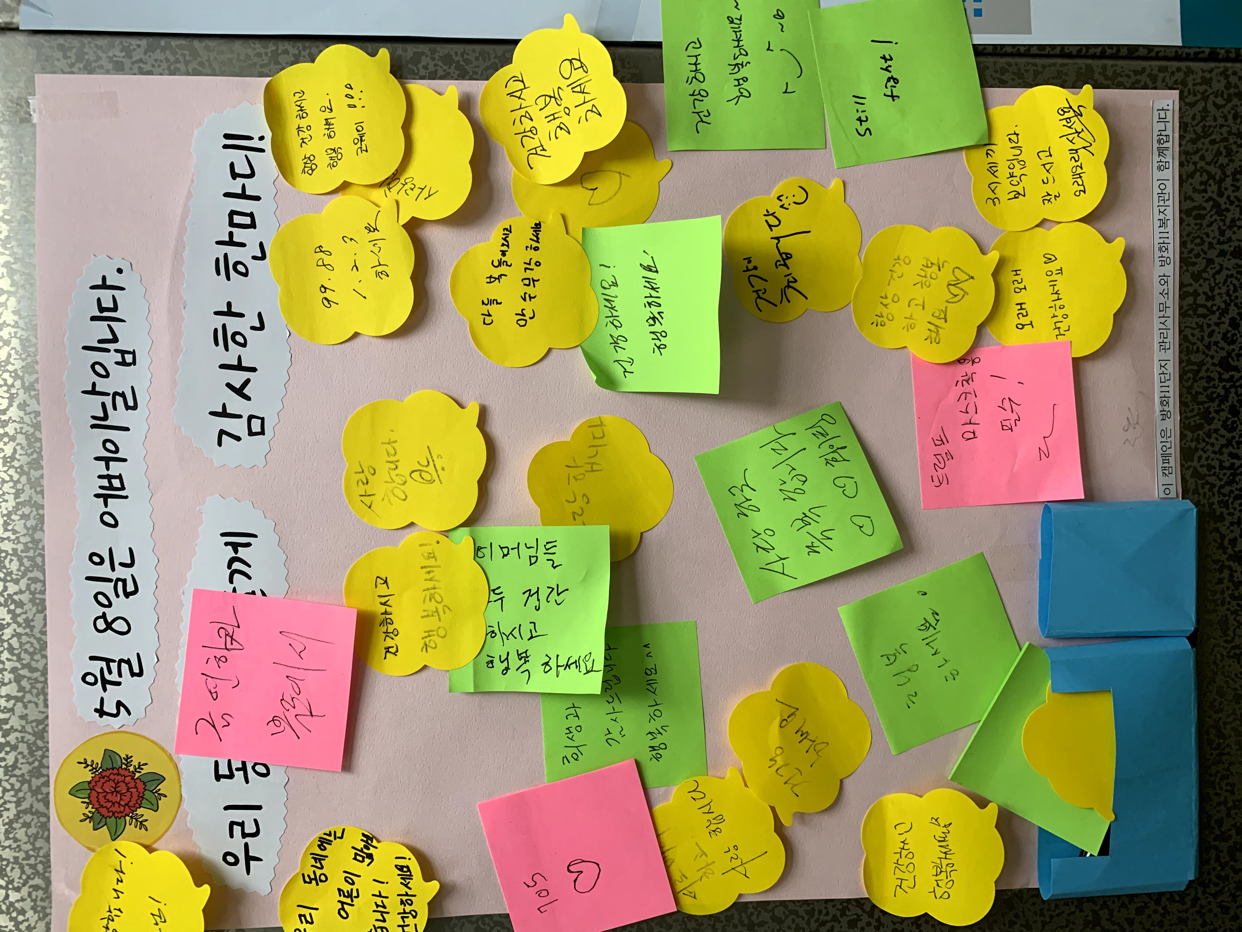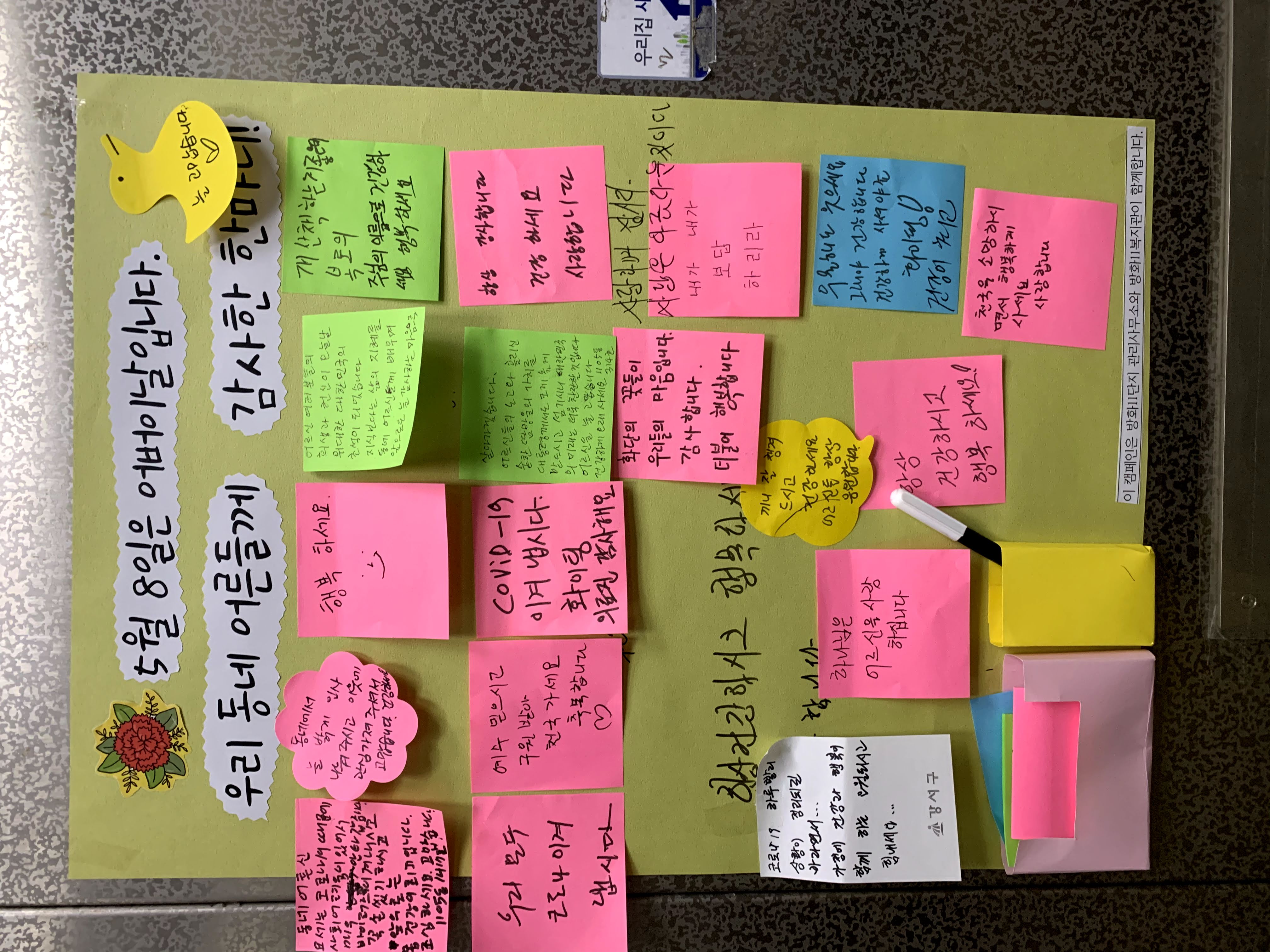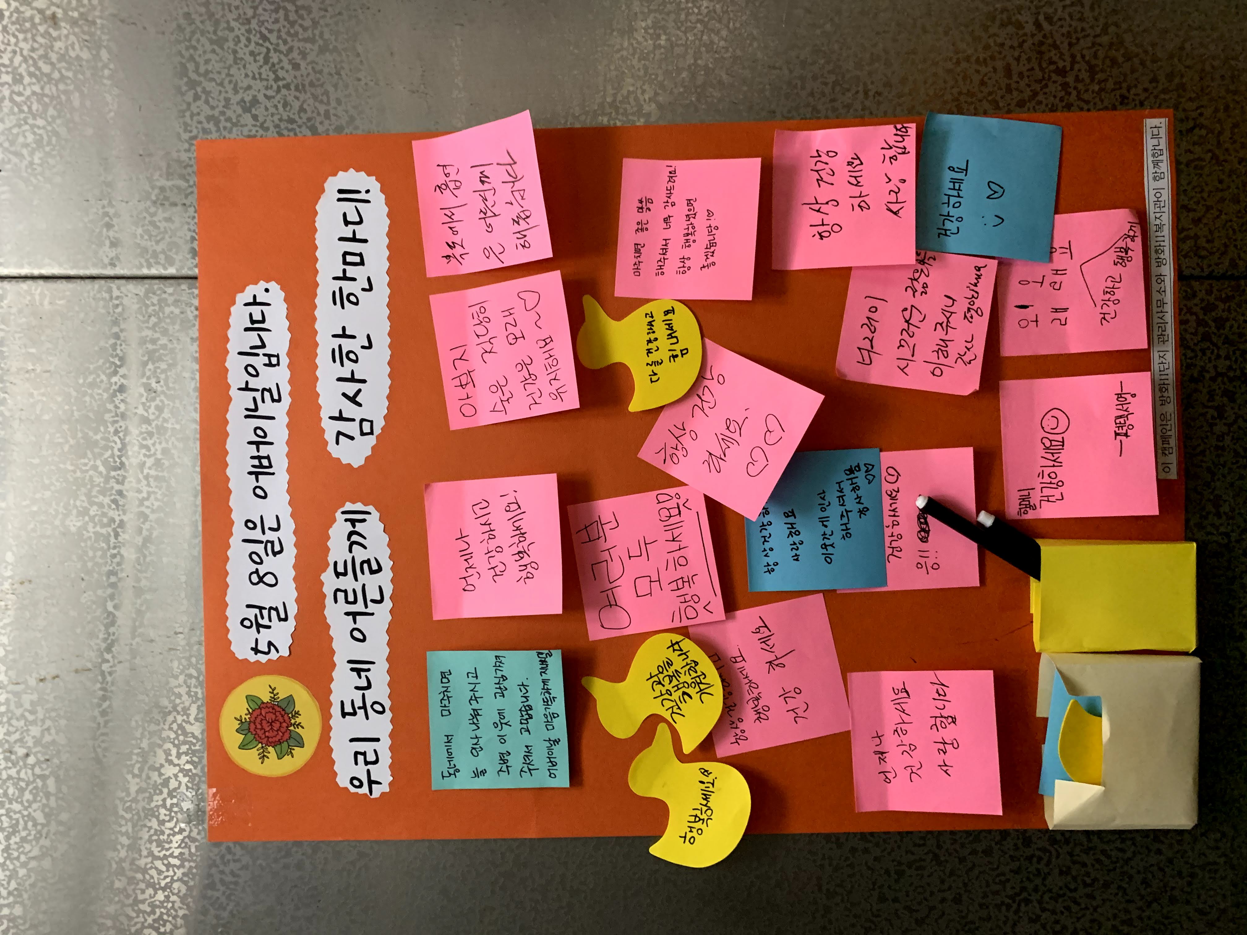 - 노대평 12단지 관리소장님 e-편한세상 아파트 관리소장님 사회복지사 선생님과 함께 캠페인을 해보니 어린이들에겐 꿈과 희망을 준 것 같아 나름 뿌듯하고 기뻤습니다. 또한, 오늘이 어버이날인데요. 4년 전 돌아가신 우리 어머님이 그리워 가슴이 뜨거웠습니다. 마음속으로 안부를 물었죠. 그리고 효에 대해 다시 한번 생각해 보는 계기가 되었던 것 같습니다. 다음에도 얼마든지 함께할 수 있어요. - 동윤 어머니(1207동 대표) 엘리베이터에 붙여진 걸 보고 관리사무소 소장님이 달라지니 우리 아파트까 이렇게 따뜻해지는구나 싶었어요. 그러다 자세히 보니 복지관과 함께 하는 거더라고요. 사람 사는 정이 느껴지고 좋았죠. 아이들 보기에도 좋고요. 12단지 동대표 회의에서 들었는데 다들 좋다고 했어요. 어떤 분은 방송을 듣고 마음이 따뜻해 지셨대요. 저는 어버이날 방송만 들었는데 어린이날 방송도 그렇게 좋았다고 하더라고요. - 오찬별 아동 어머니(1207동) 엘리베이터에 붙어있는 걸 오며가며 봤어요. 마음이 잠시 따스해지며 사랑이 느껴졌어요. 아직 이러한 마음들이 존재하고 있구나~하고. 좋았습니다. - 하은, 하민 아버님(1206동) 복지관과 관리사무소가 함께 하는 거였군요. 하은 하민이도 한장 씩 붙였습니다. 마주치는 주민분들도 보시고는 활짝 미소지으십니다. 어려운 시기에 큰 기쁨 주시네요^^ - 아빠와 아이들 (e-편한세상아파트) “이거 오가다 보니 어떠셨어요?” “아이들한테 좋은 것 같아요.” “저거 우리 언니가 적었어요.” “저요. 제가 적었어요.” 손을 번쩍 들며 자기가 적었다고 엄청 씩씩하게 말해주었습니다.