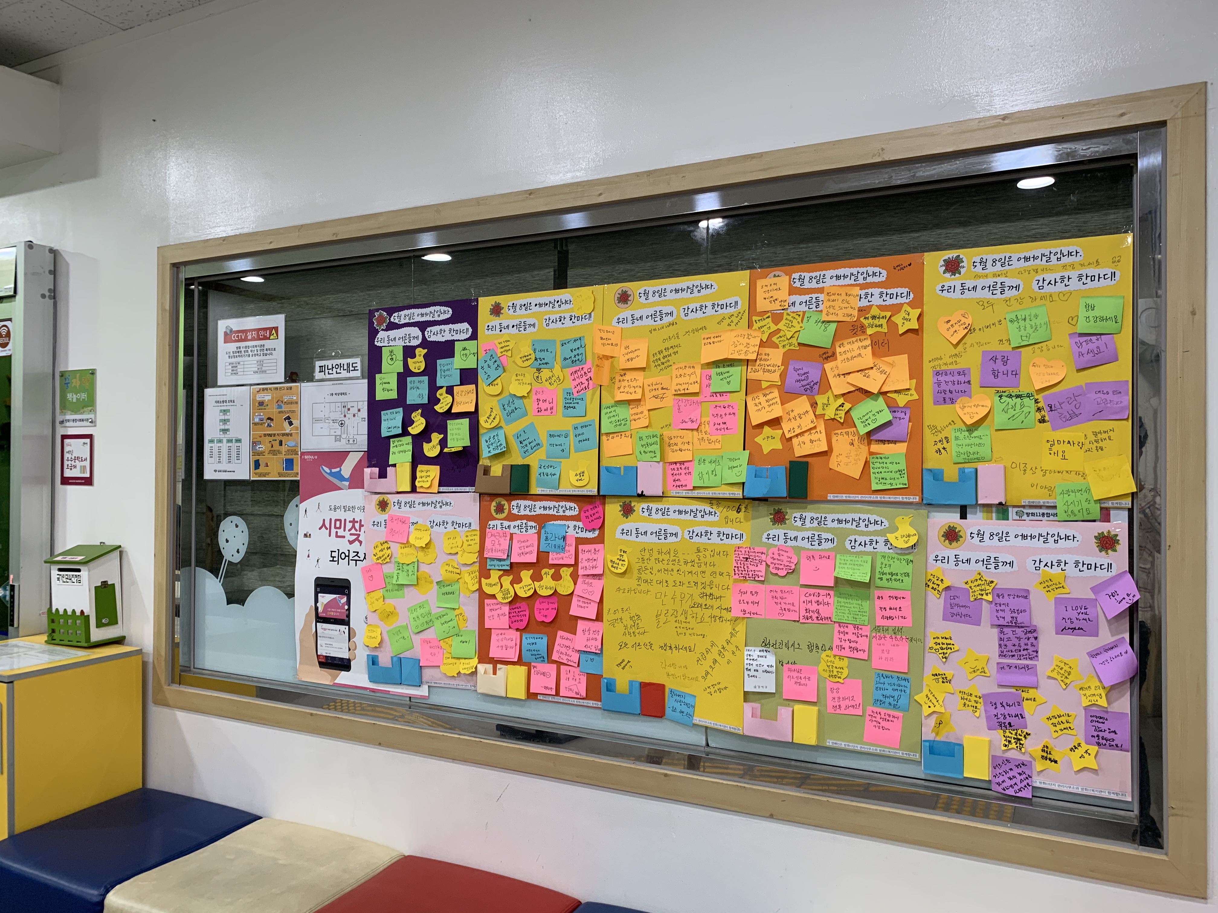 붙임쪽지판을 폐기하기는 아까웠습니다. 복지관 1층 현관에 모두 붙였습니다.