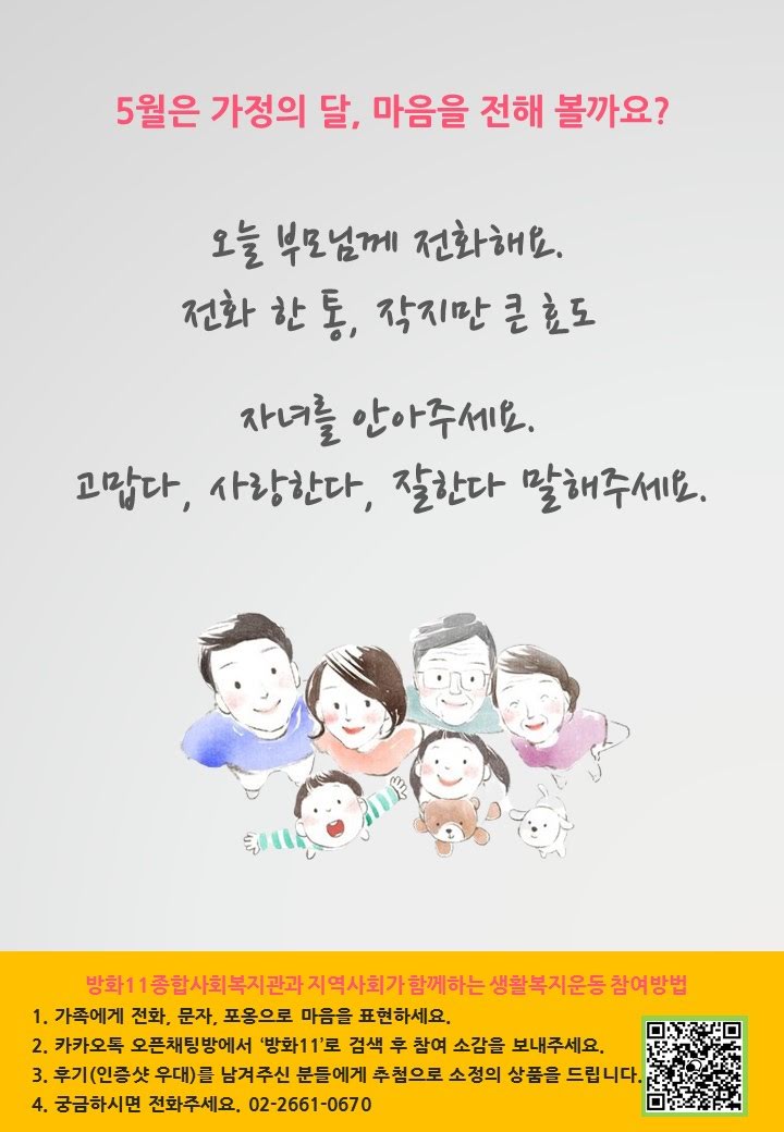 안녕하세요? 방화11종합사회복지관과 관리사무소가 함께하는 가정의 달 캠페인 방송입니다.