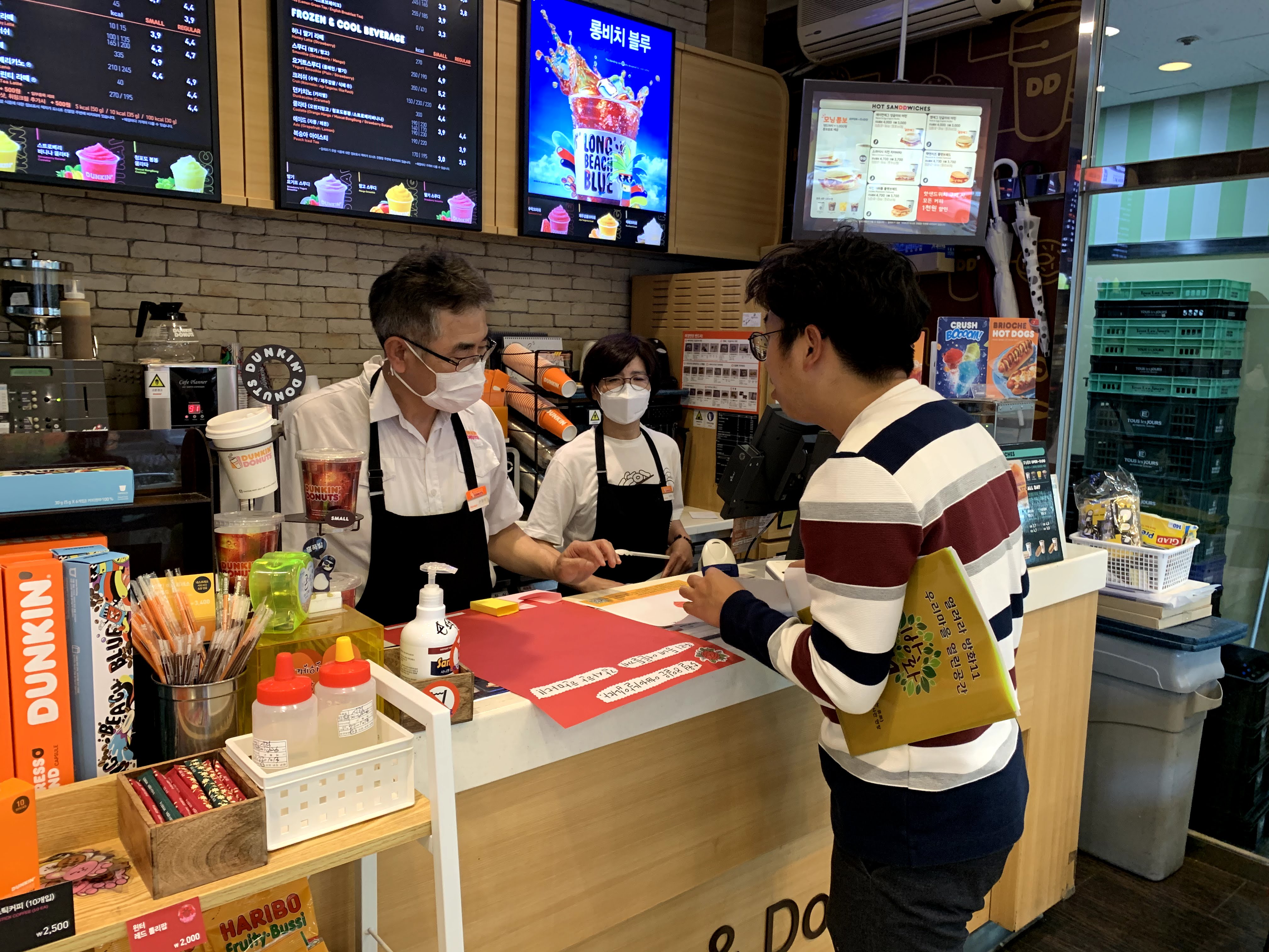 황제떡볶이 사장님은 직접 테이프로 가게에서 안팎으로 제일 잘 보이는 곳에 붙여주셨습니다. 몽키바나나는 ‘꿈을 잡아라’ 사업 수료식을 한 카페이기도 합니다. 하우정 선생님께서 사장님께 잘 설명하고 부탁했습니다. 사장님께서 가게 제일 잘보이는 곳에 붙이라고 하셨습니다. 던킨도너츠에서는 빵을 사먹으며 사장님과 이야기 나눴습니다. 30년째 가게를 운영하시고 공항동 성당에서도 여러 구제 활동을 하고 계십니다. 가게 거울에 예쁘게 붙였습니다. 빚은떡집 사장님은 2017년 단기사회사업 수료식으로 가게를 내어주신 분이기도 합니다. 가게 입구에 홍보지를 붙여주셨습니다.