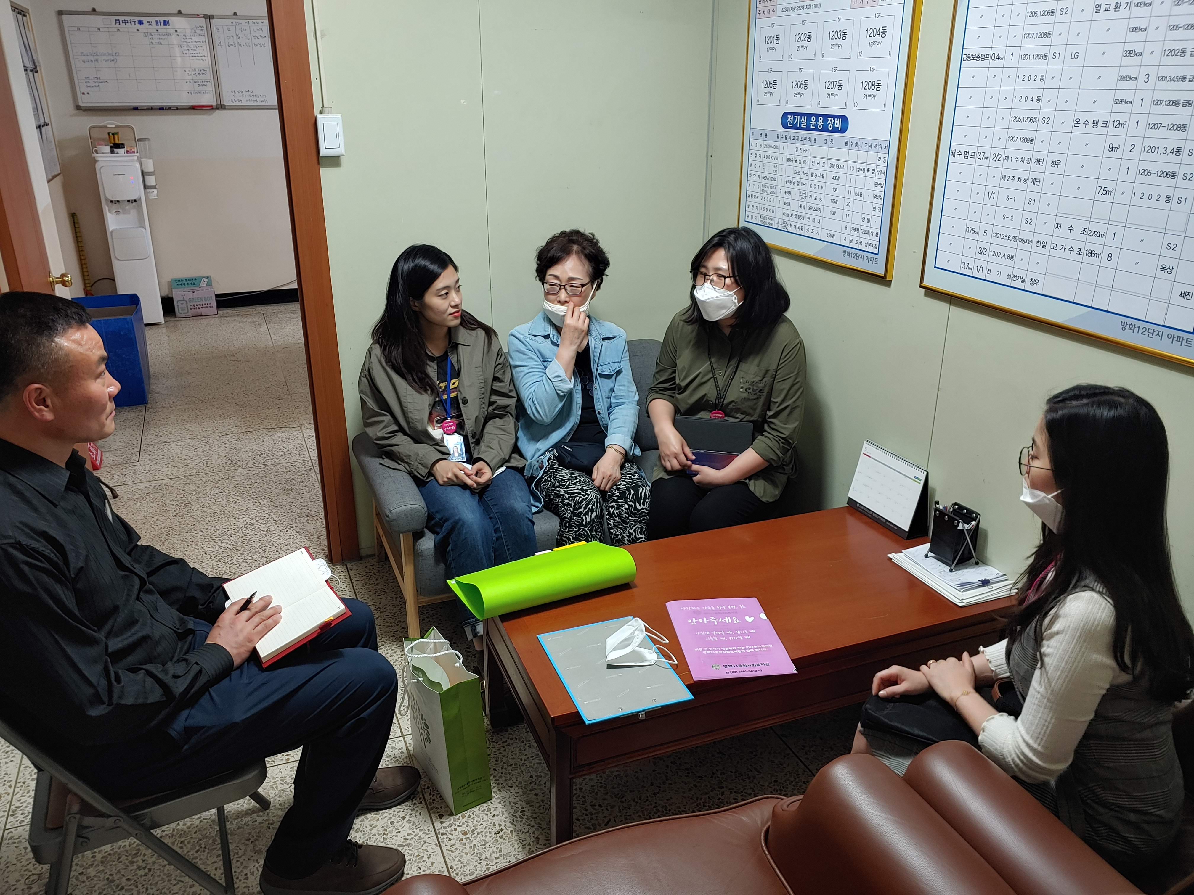 12단지 관리사무소에 방문했습니다. 새롭게 부임한 소장님의 첫 출근 날이기도 합니다. 김미경 과장님께서 평소 복지관과 교류가 많고 12단지 동대표이기도 하신 이정자 님께 관리사무소 방문을 함께해주시기를 부탁했습니다. 이정자님께서 흔쾌히 함께 동행해주셨습니다.