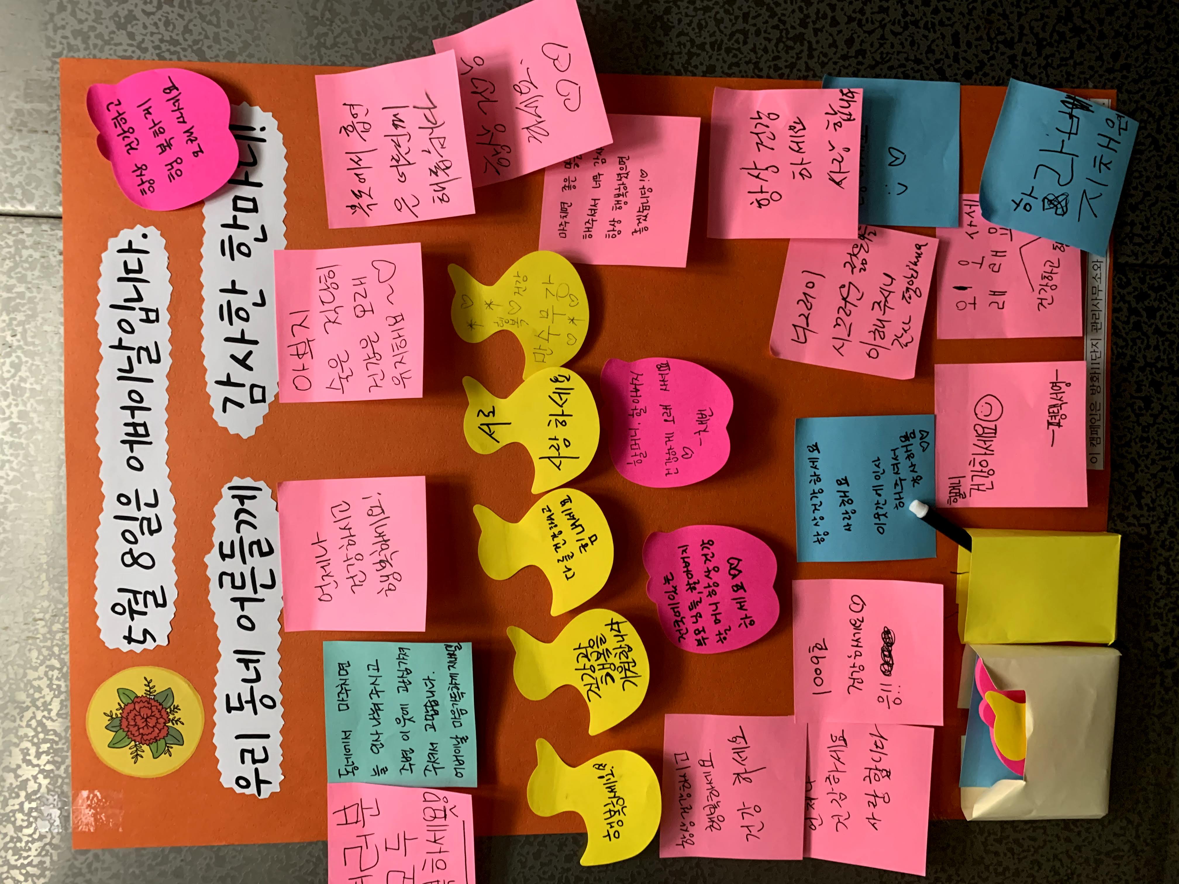 문자 1 세상 각박하고 어려운 시기에 좋은 아이디어로 인하여 서로가 웃어른을 생각할 수 있는 기회가 되어 따듯해지는 마음과 함께 메세지를 쓰게 되어 뿌듯하였습니다. 앞으로도 더욱더 서로가 이웃을 생각할 수 있으며 칭찬을 많이 하여 정겨운 이웃과 웃어른들께 공경할 기회를 만들주시면 고맙겠습니다. 홧이팅하세요. 감사합니다 문자 2 어버이날 포스트잇 이벤트 정말 좋았습니다! ^^ 모두 어른들께서 감동 받으셨겠지만, 특히 혼자 사시는 어른들께서 더 감동 받으셨을 것 같아요. 좋은 이벤트 감사합니다! ^^ - 문자 3 딸 : 아파트 엘리베이터에 이렇게 붙어 있어서 어버이날이구나 생각이 들었습니다. 덕분에 아침 출근길 엄마에게 안부 전화를 할 수 있었습니다. 전화를 받으신 어머님이 기뻐하셨습니다. 바쁜 생활 속 그렇게 먼저 챙겨주셔서 고맙습니다. 어머님 : 30년을 이 아파트에 살았는데 이때까지 한 번도 보지 못했는데 어느 복지사님인지 이렇게 세심하게 챙겨줘서 정말 고맙습니다. 써놓는 것도 대단한 게 그걸 다시 사진 찍어 붙여줘서 고생이 많고 감사합니다. - 문자 4 엘리베이터를 타자 보이는 부모님들을 향한 사랑의 메시지를 보고 마음이 참!! 따뜻하였어요. 저두 세상의 모든 부모님들이 건강하시길 빌며 한자한자 써내려갔는데..^^ 정말 행복한 시간이였습니다. 다음에도 좋은 주제로 또 만났으면 좋겠어요 ^^♥ |
