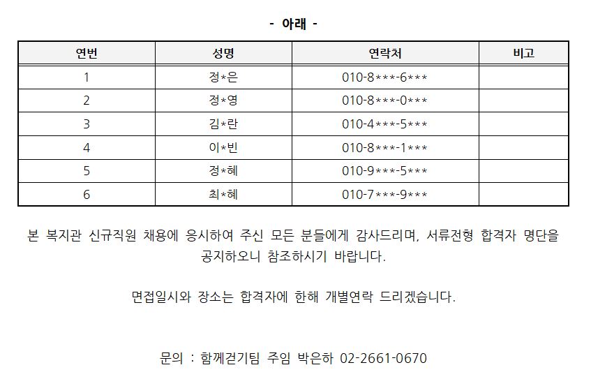 아래와 같이 서류전형 합격자가 결정되었기에 이를 알립니다.