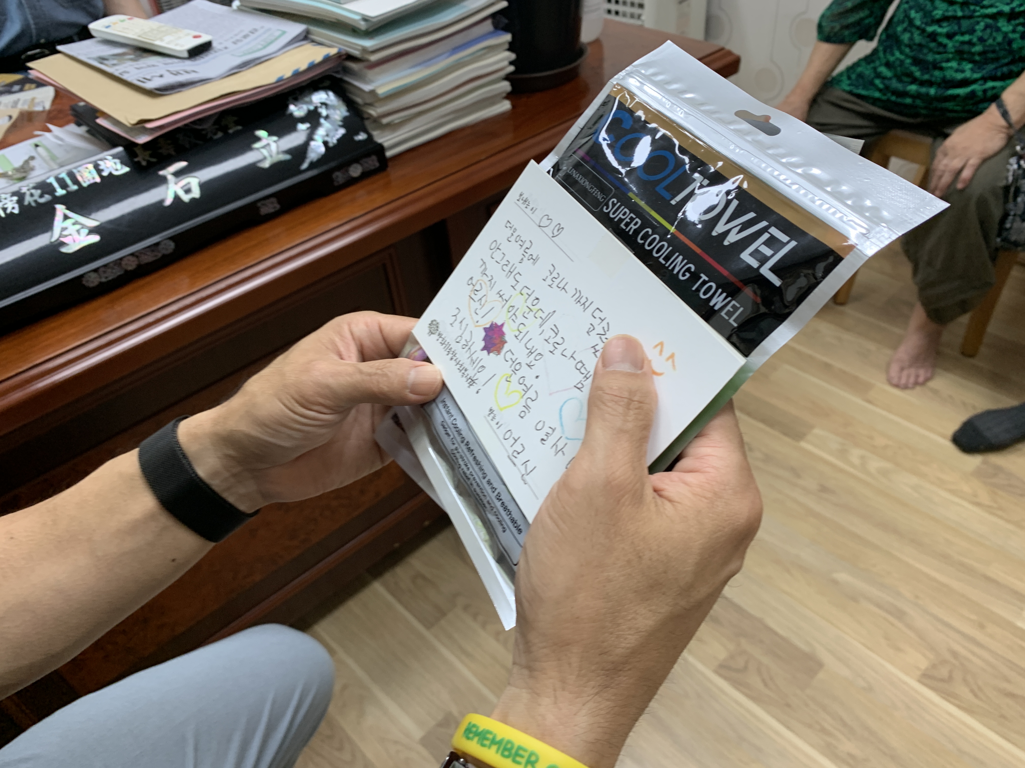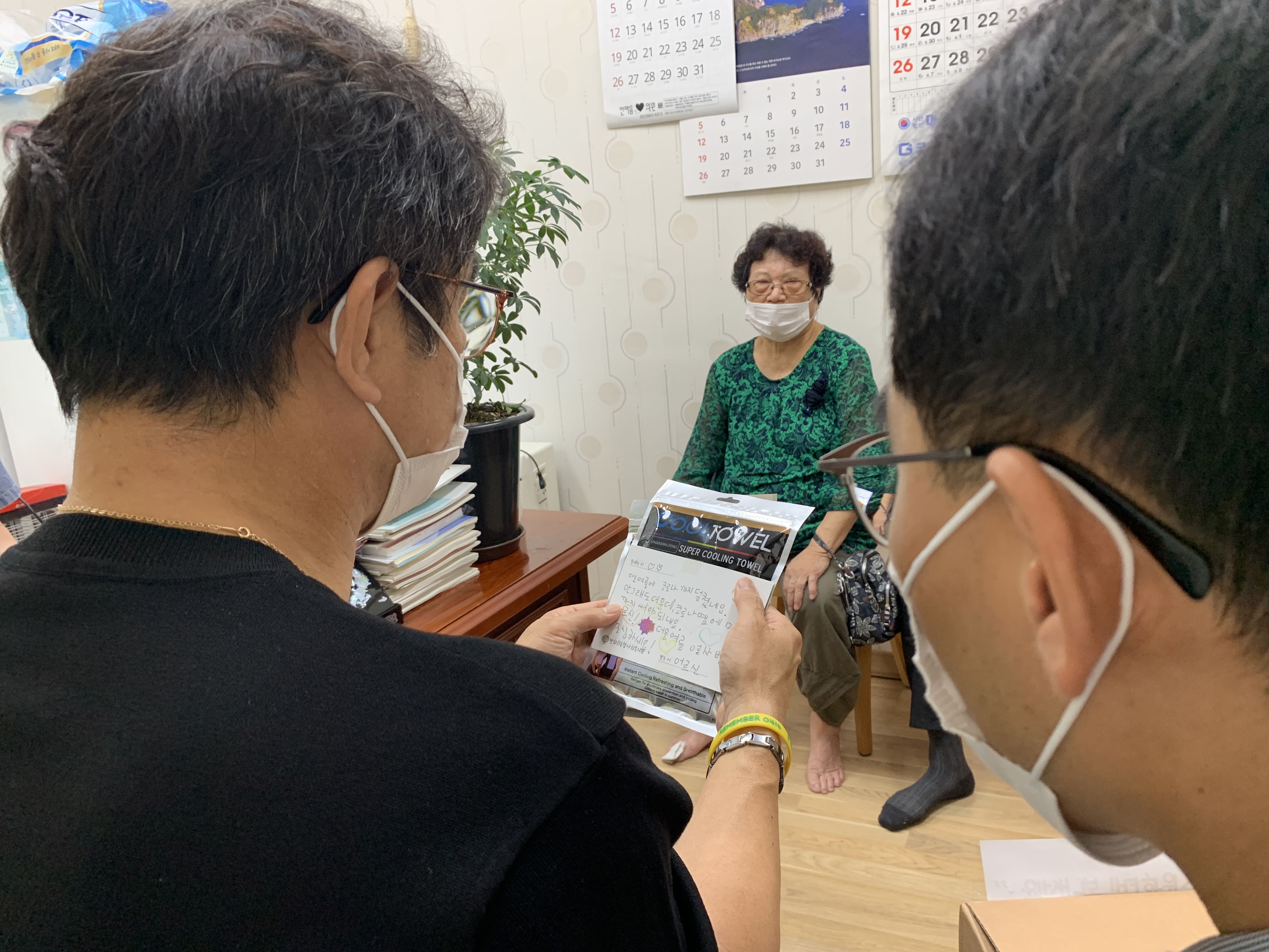 정성스럽게 적은 엽서 글을 읽어드리며 쿨타올을 함께 전해드렸습니다.