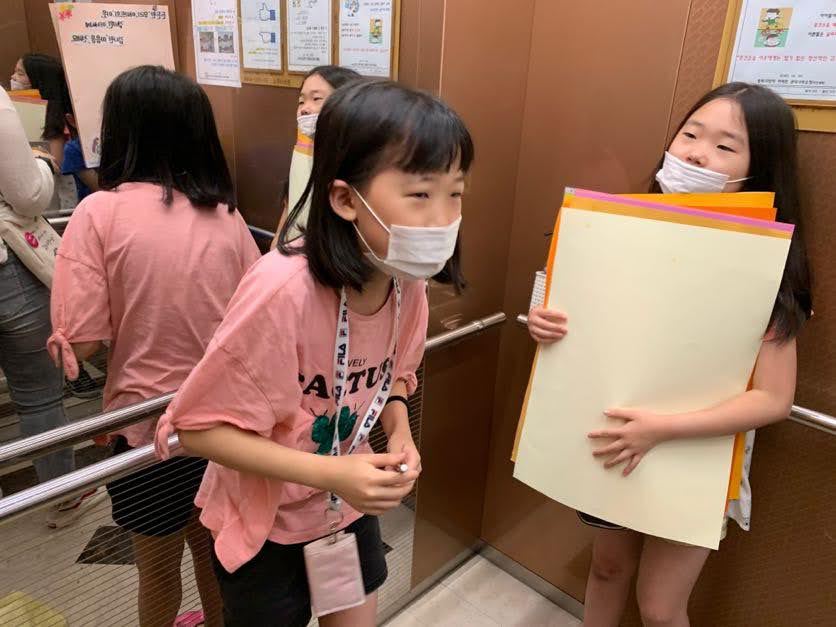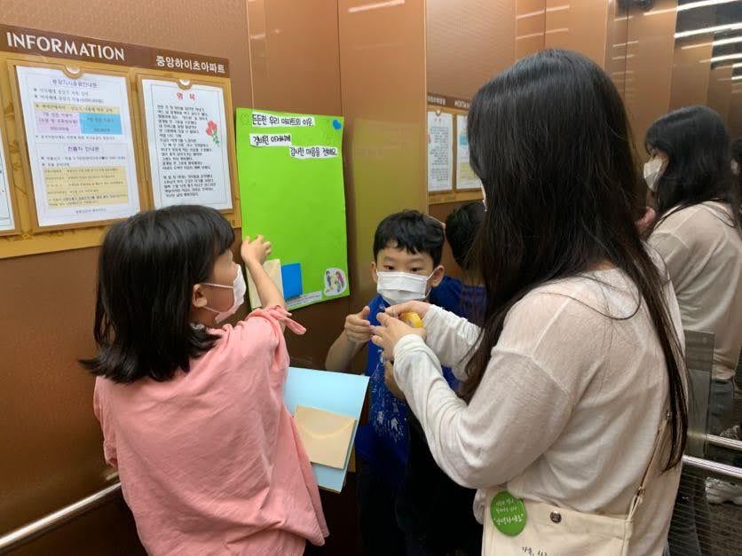 어린이 기획단이 홍보지를 만들어 엘리베이터에 부착합니다.