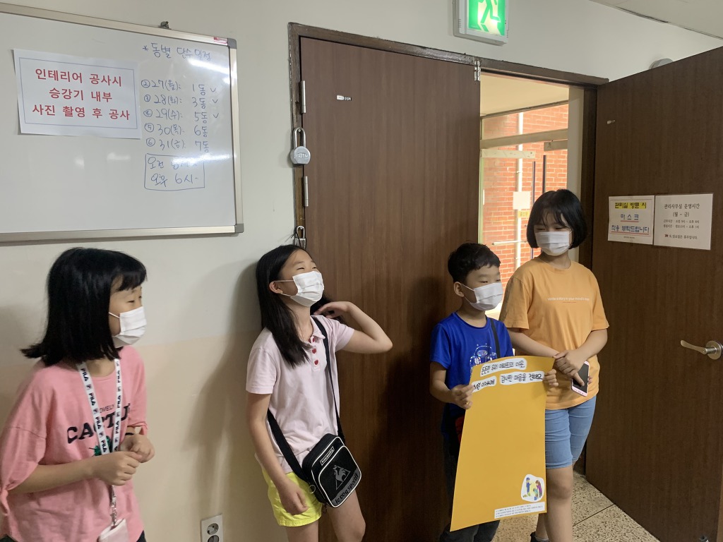 아이들이 만들 홍보지를 엘리베이터에 부착해도 되는지 물어보기 위해서입니다.