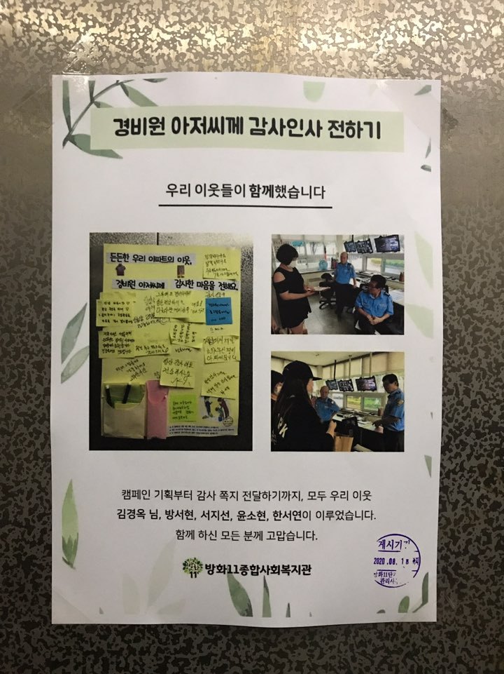 경비원 아저씨께 직접 감사인사를 전달한 이야기를 넣기로 했습니다.