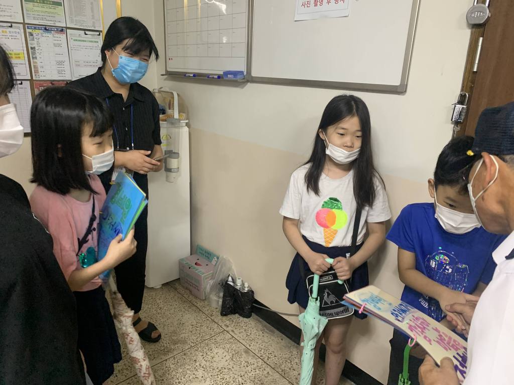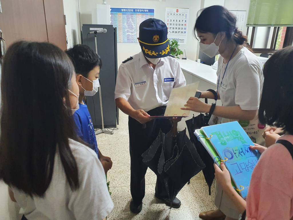 혜민이가 경비반장님께 책을 건네 드렸습니다.