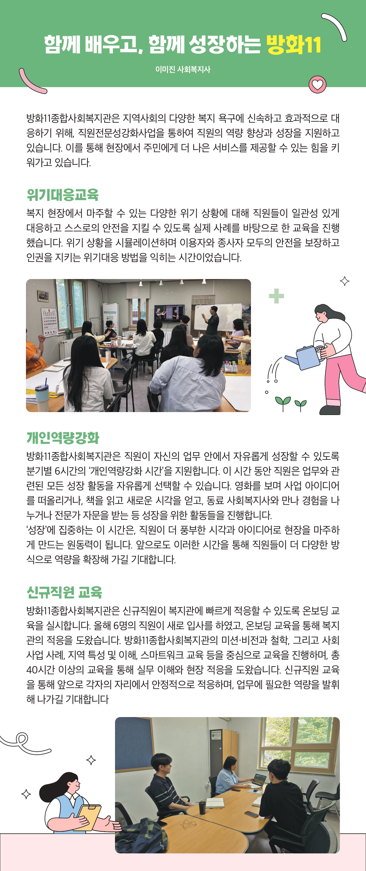 주소 : 우)07611 서울시 강서구 개화동로 21길 4(SH공사 11단지 내) 방화11종합사회복지관