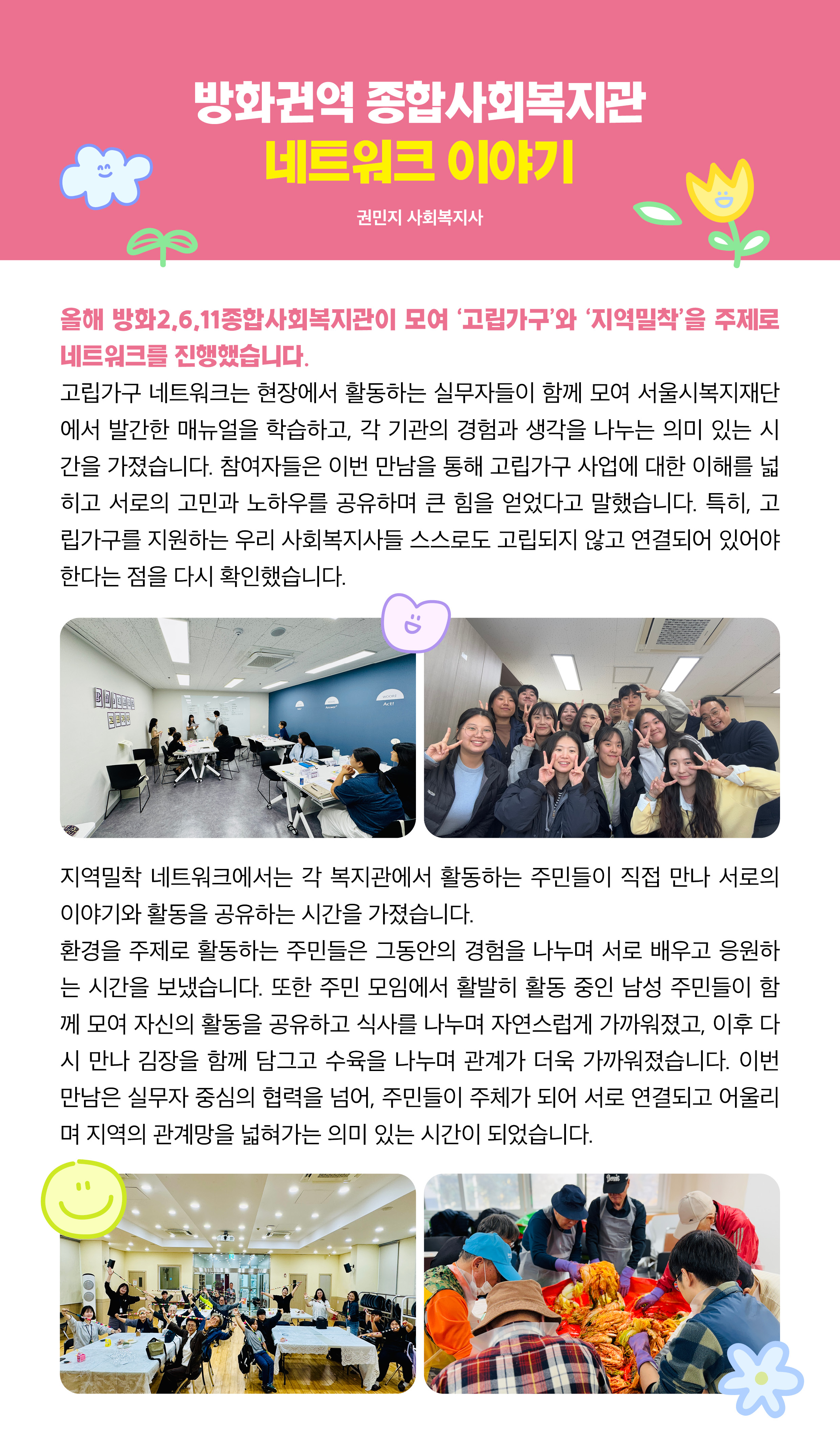 주소 : 우)07611 서울시 강서구 개화동로 21길 4(SH공사 11단지 내) 방화11종합사회복지관